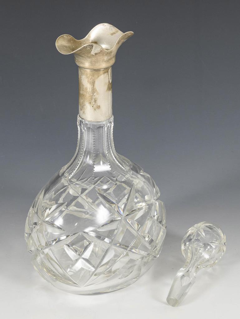 Richly cut glass body with smooth silver mount and glass stopper. Signs of use, few chips to the body.