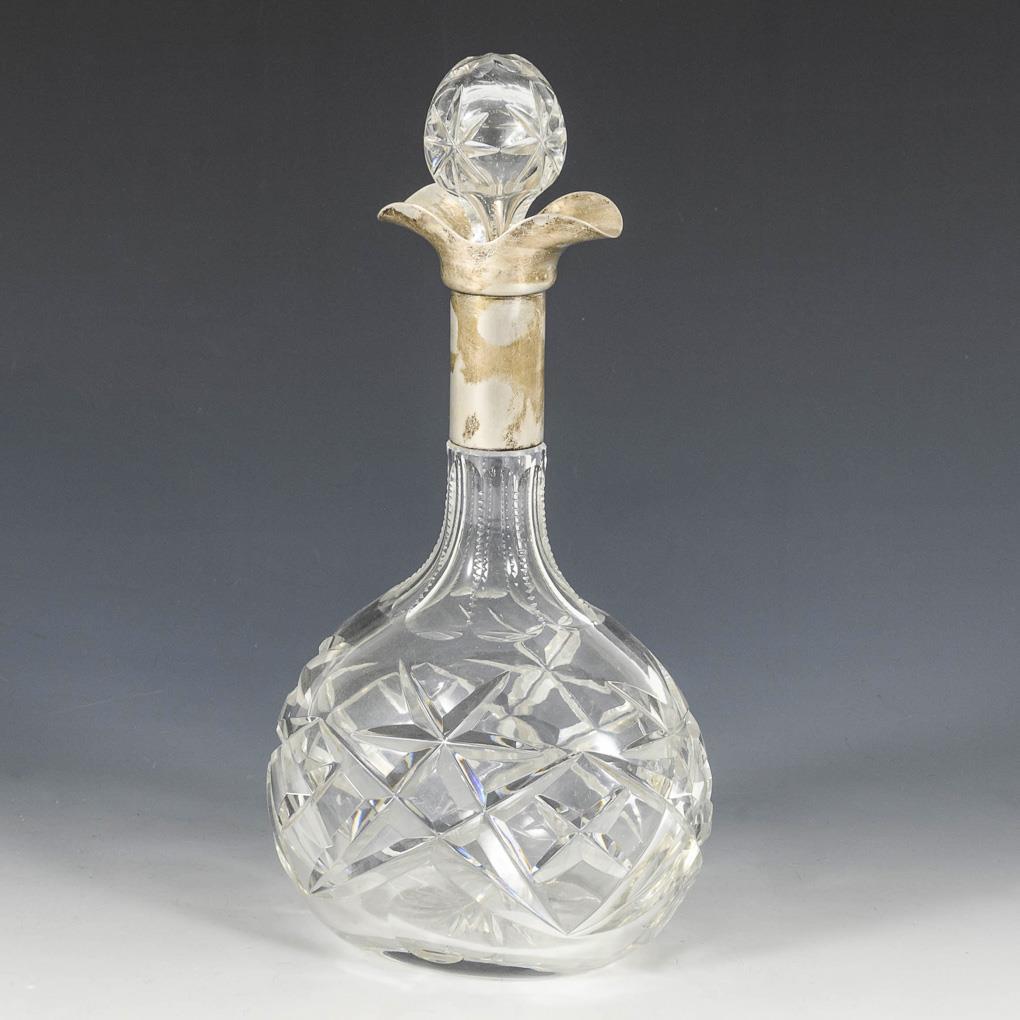 Richly cut glass body with smooth silver mount and glass stopper. Signs of use, few chips to the body.