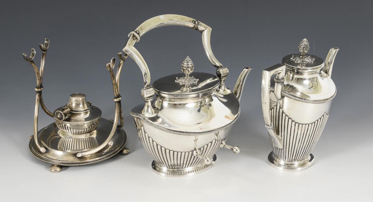 Oval, partially ribbed form with crowned monogram engraving "AAH": Teapot on rechaud, h 27 cm. Mocha pot, h 19 cm. Small teapot, h 13 cm. Sugar bowl, H 7 cm. Milk jug, H 9 cm. Minimal signs of use, 1 insulating ring missing from the teapot.