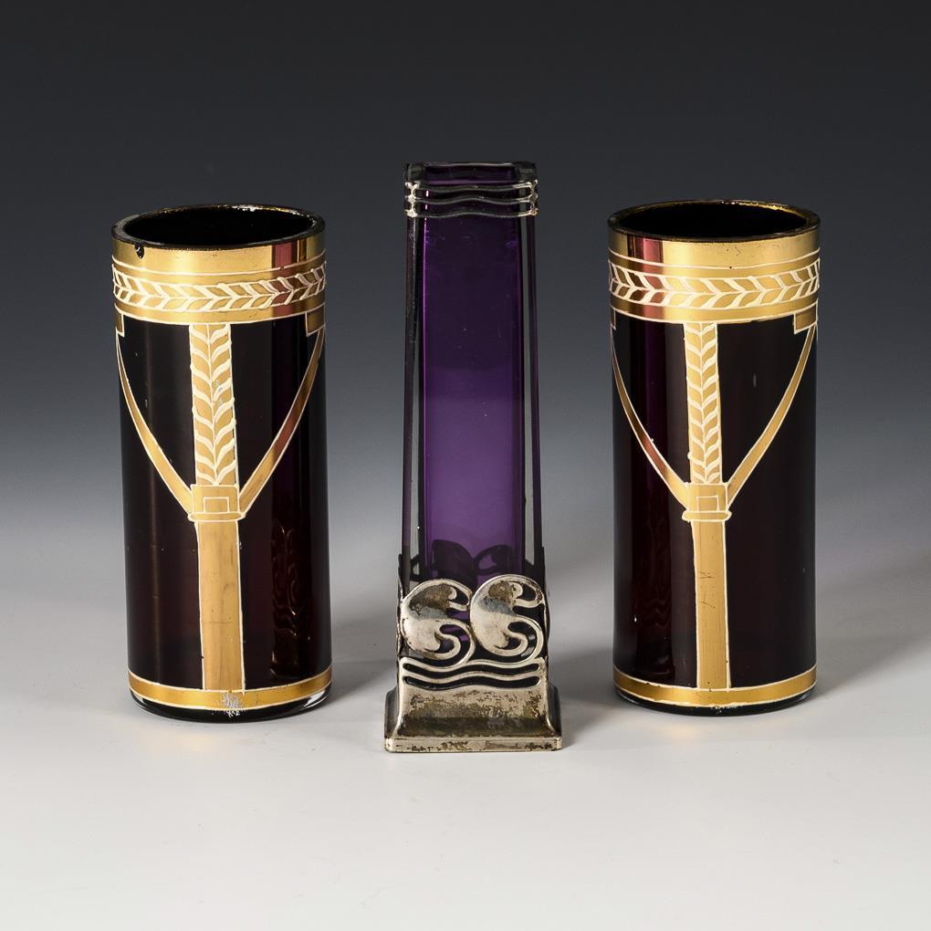 2x Josef Riedel, around 1900: Cylinder vases made of ruby red glass with gold and enamel painted line pattern (h 12 cm). / 1x square-conical vase of colorless glass with purple interior and silver-mounted stand and rim (indistinct minerva head punched; h 13.5 cm). Gold partly rubbed, 1 rim chip.