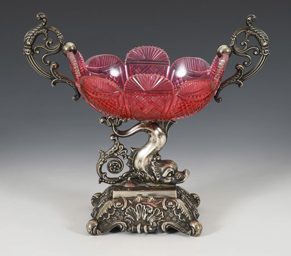 Pink-colored, richly cut glass bowl with silver base and 2 decorated handles. Small rim chips to the bowl, 1 handle loose.