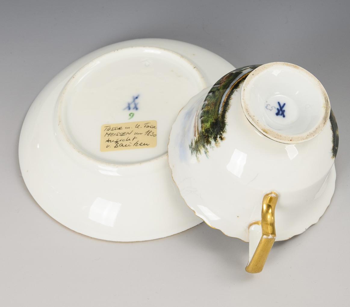 Polychrome painted, decorated in gold. Cup (h 7 cm), completed saucer (Ø 14 cm).