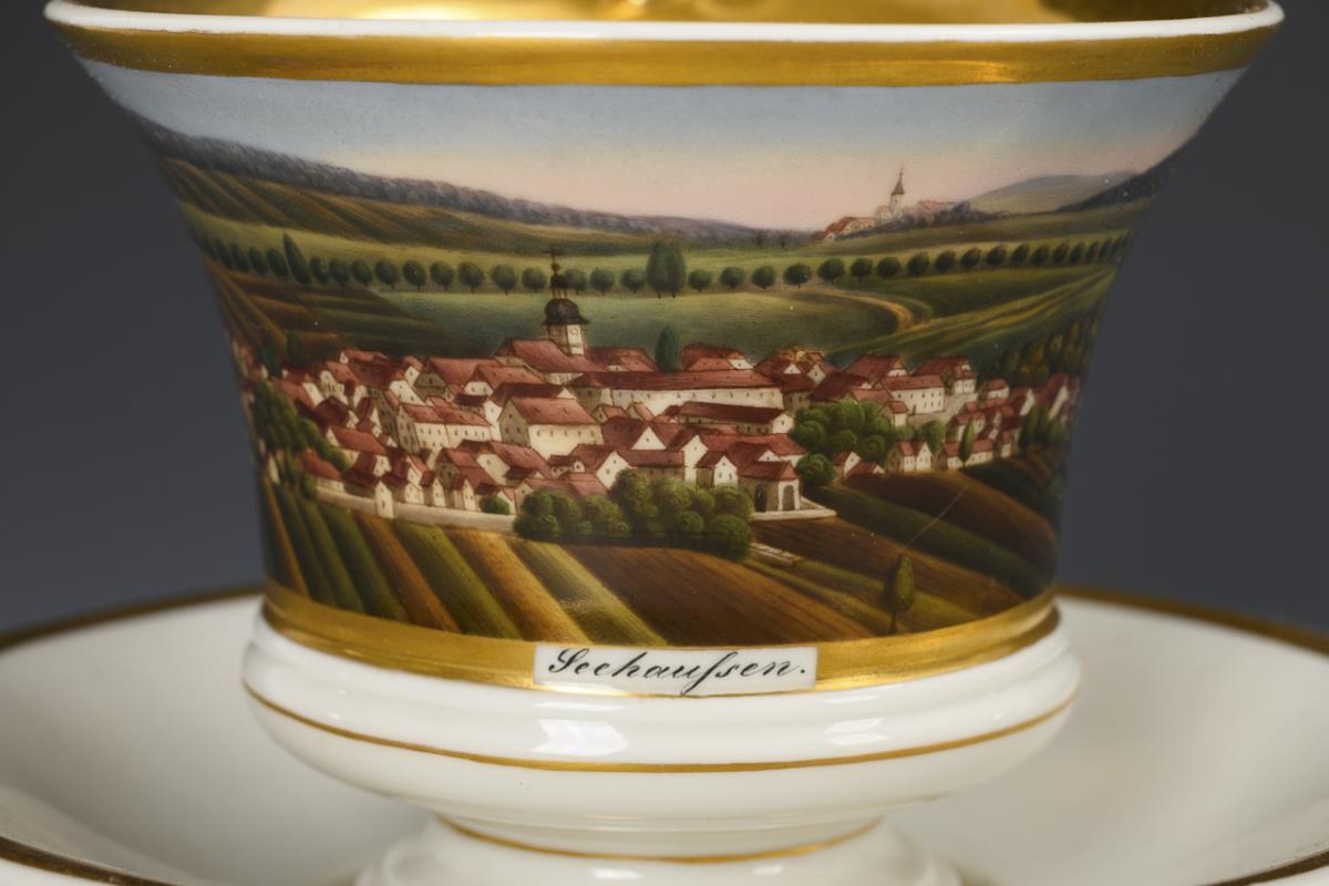 Footed crater cup with palmette handle. On the front a gold-framed rectangular cartouche with the inscribed view of the town of Seehausen.