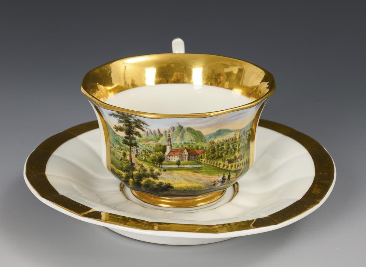 Footed, polygonal bell-shaped cup with tapering handle. On the front a gold-framed rectangular cartouche with the inscribed view of the village of Fischbach in the Giant Mountains.