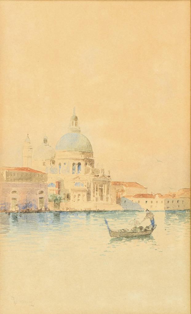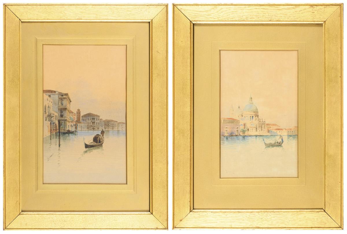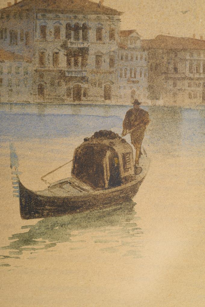 Each depicting a gondolier on the water near the houses and once the church of Santa Maria della Salute.