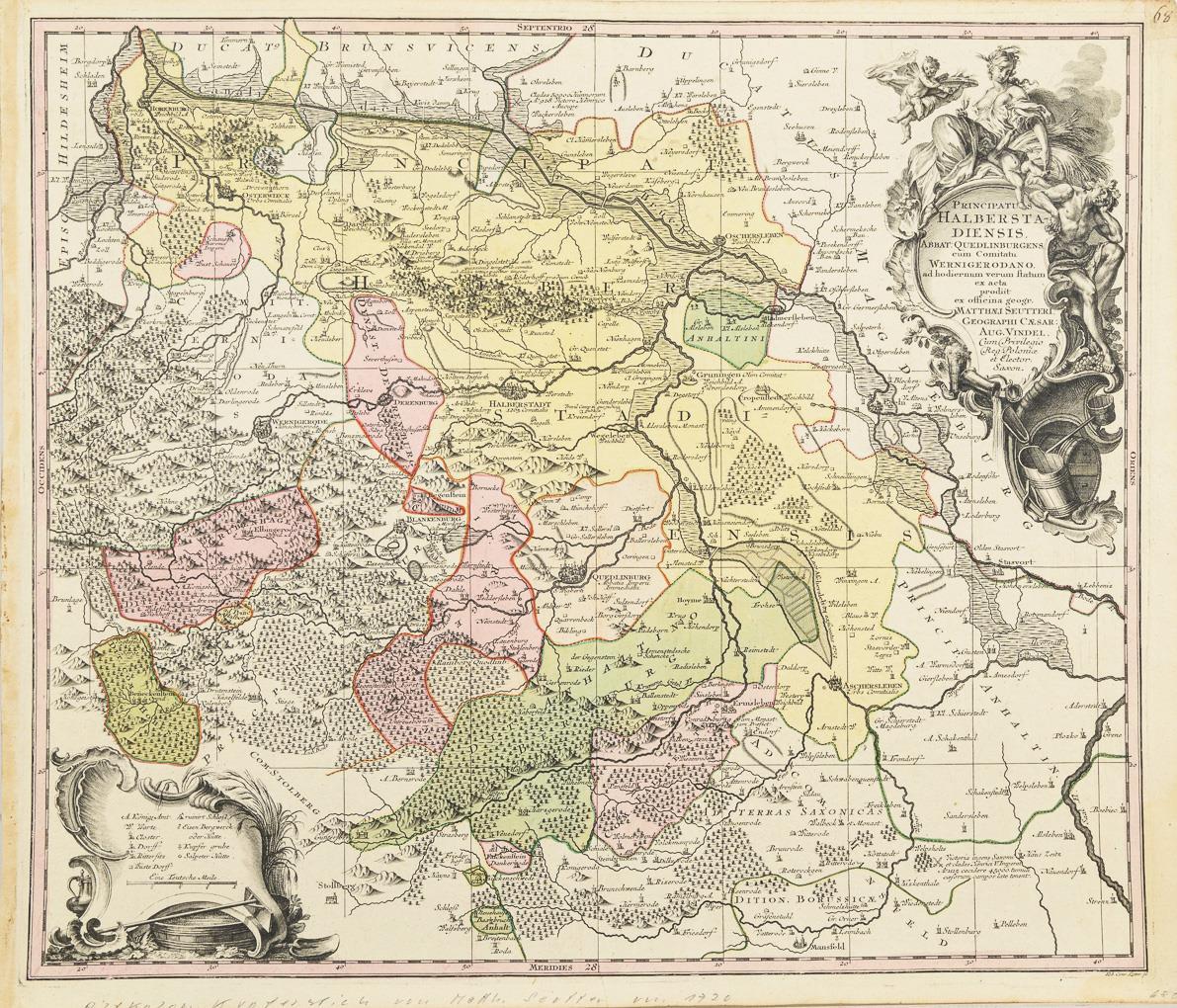 Map "Principatus Halberstadiensis". Areas around Halberstadt, Quedlinburg and Wernigerode, with an allegorical depiction at top right. Handwritten "68" at top right, annotated in pencil.