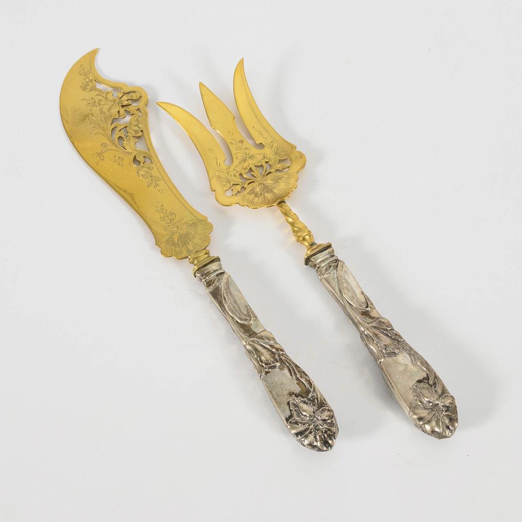 Silver handles with flowers in relief, tines and blade gilded and decorated with floral engravings.