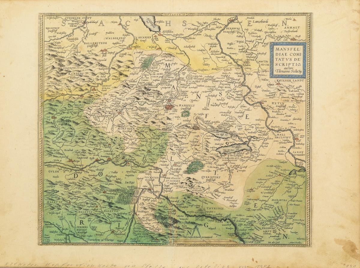 Map of the possessions of the town of Mansfeld and the surrounding area, including the neighboring areas. Paper stained, margins brown and slightly torn, with pencil annotation.