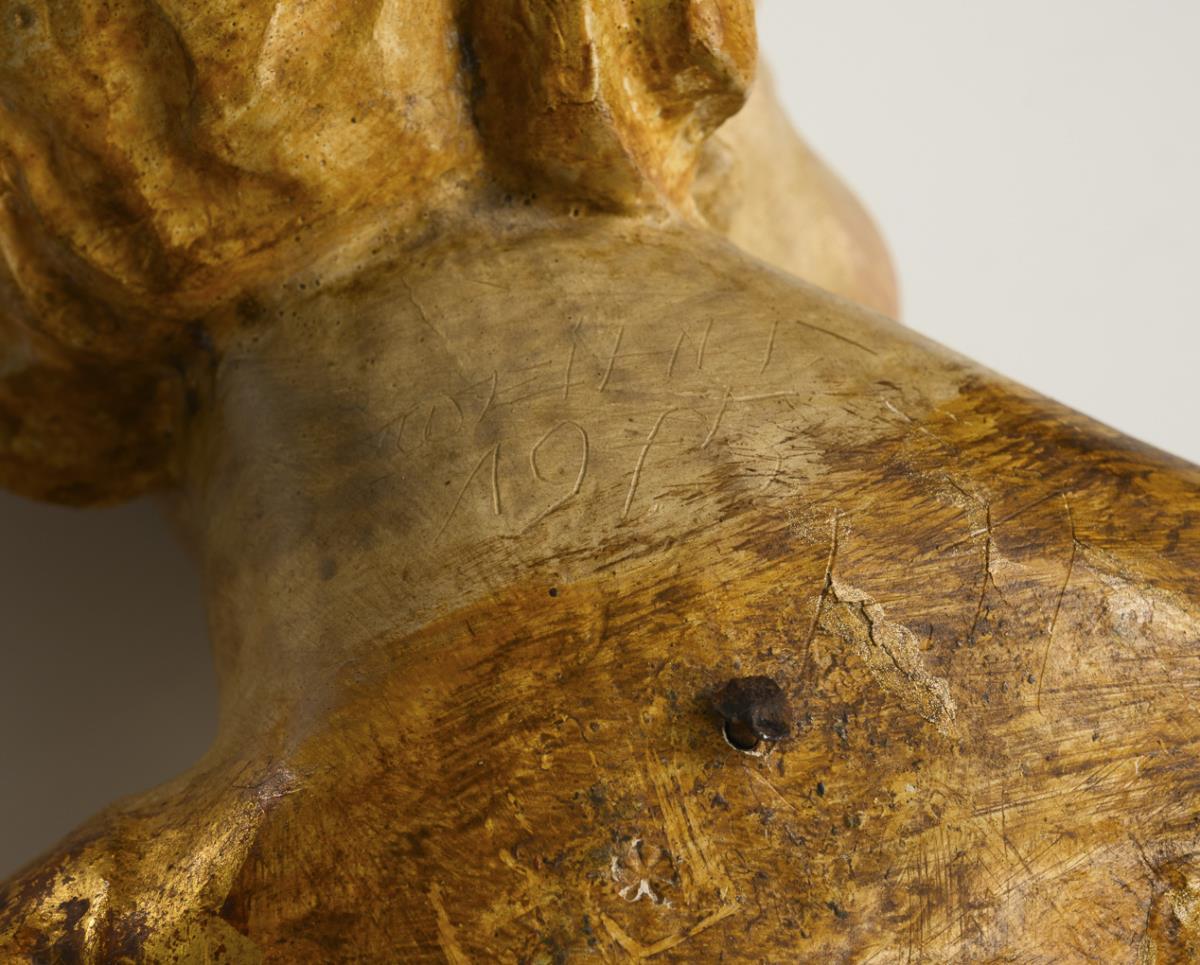 Wood polychrome painted and partly gilded. 1x scratched indistinct inscription (width...?) on the reverse with date 1975. H maximum 21 cm, W maximum 23 cm.