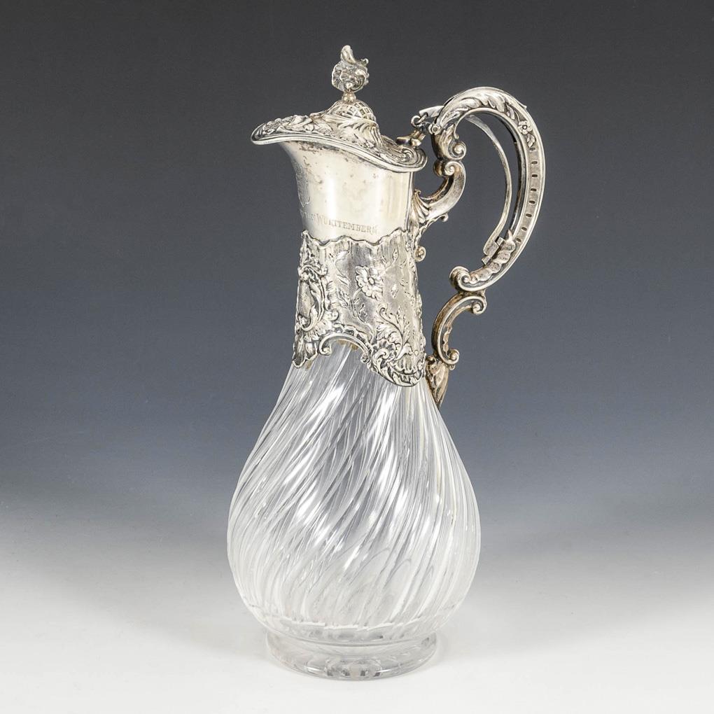 Godronized glass body with richly reliefed silver mounting and crowned coat of arms engraving "Herzog Robert von Württemberg". Curved patent handle. Glass with tiny chips.