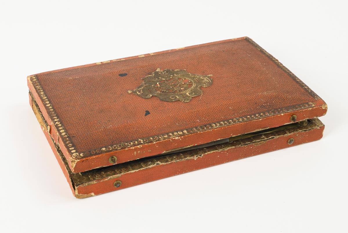 Wooden box with red calico cover and gold-colored paper overlays. Brass, iron and mahogany fittings. Box 2.5 x 20 x 12.5 cm.