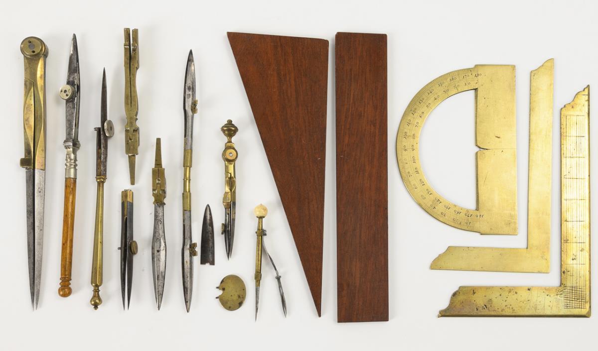 Numerous compasses as well as wooden ruler and triangle in the box. Strong signs of age/use on the box with missing parts. Few missing parts, some replaced.