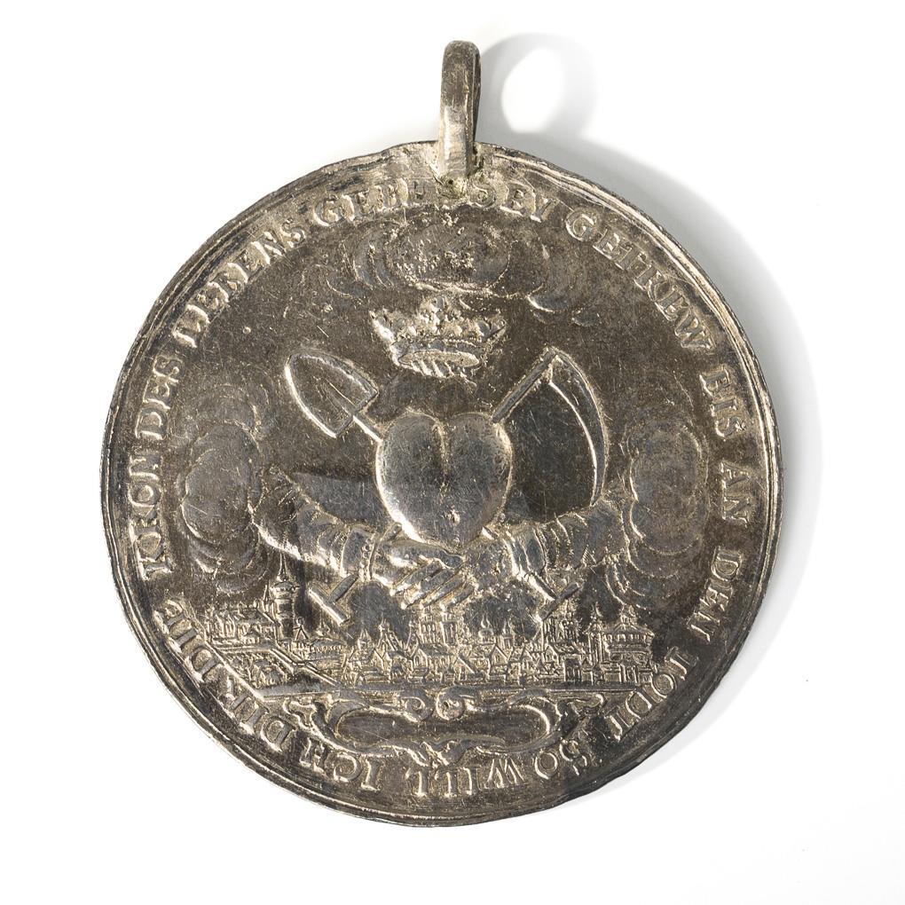 "On you, man, your sin is multiplied, therefore God strikes you with the" "But if one hand strikes you, the other will come and bring the ribbon" / "Be faithful unto death, and I will give you the crown of life". With soldered eyelet. Some rubbing, but all clearly visible.