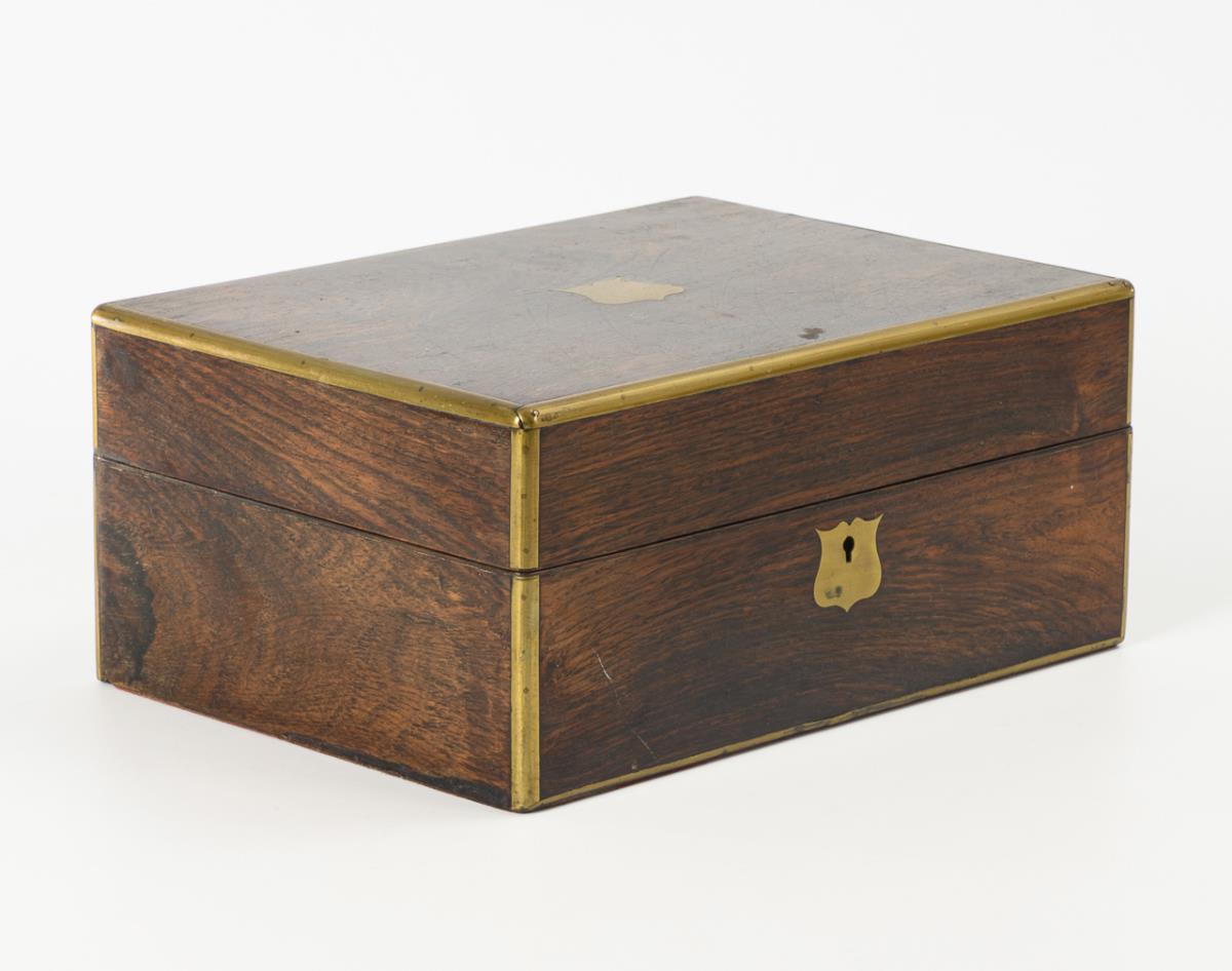 Ashlar box with brass inlays on the edges and an empty coat of arms shield on the hinged lid and as a keyhole cover. Hinged document compartment in the lid. Compartment in the body with various toiletries: shaving brush and various tins and bottles. Also 2 hatpins and 1 patent nail clipper with file. Some signs of age/use, 1 bottle missing.