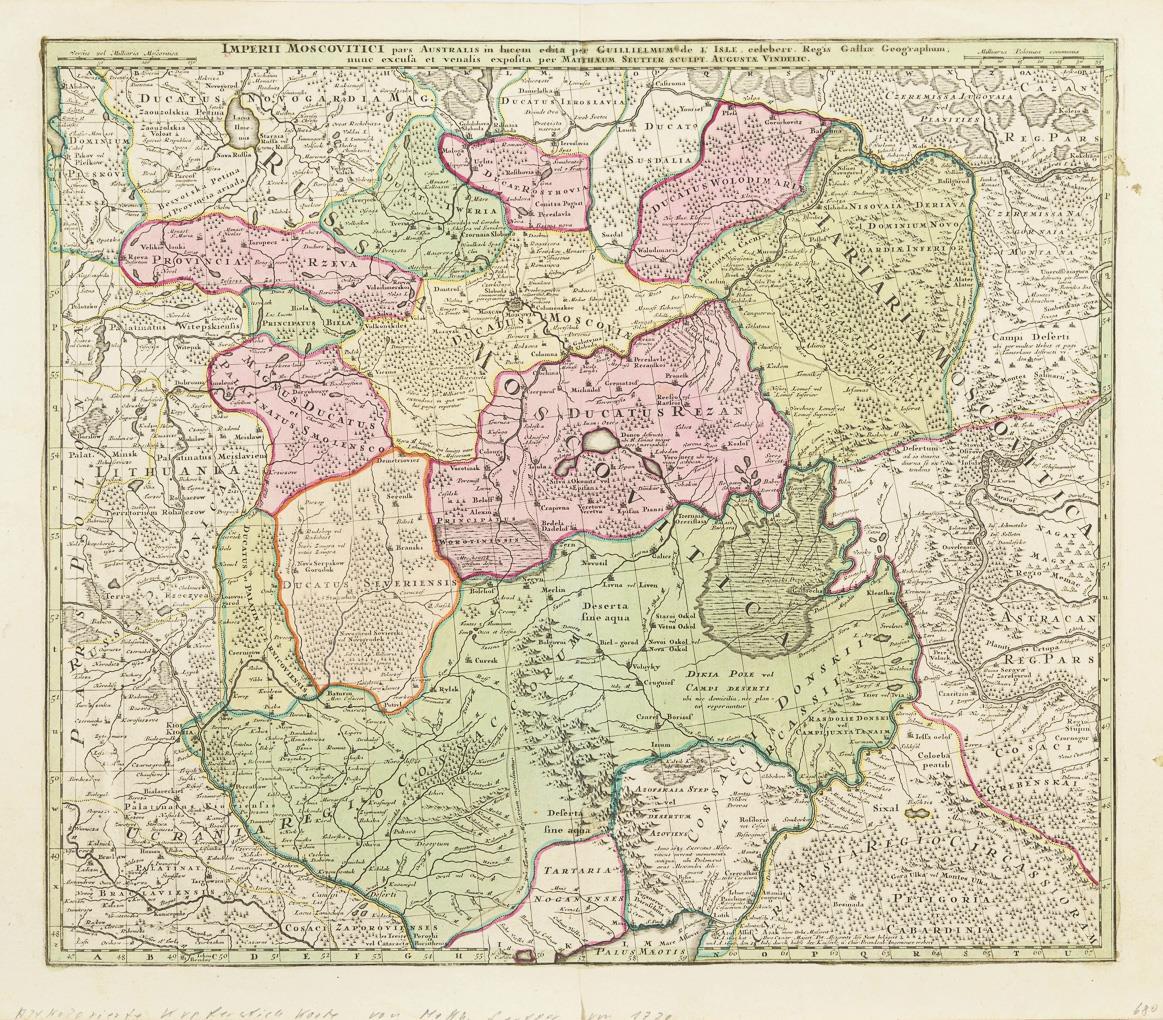 Map includes areas such as Lithuania, Poland and the Ukraine as well as Tartaria Moscovitica. Colour blurred, amateurishly coloured, impression of printing plate visible, paper soiled, with pencil annotation.