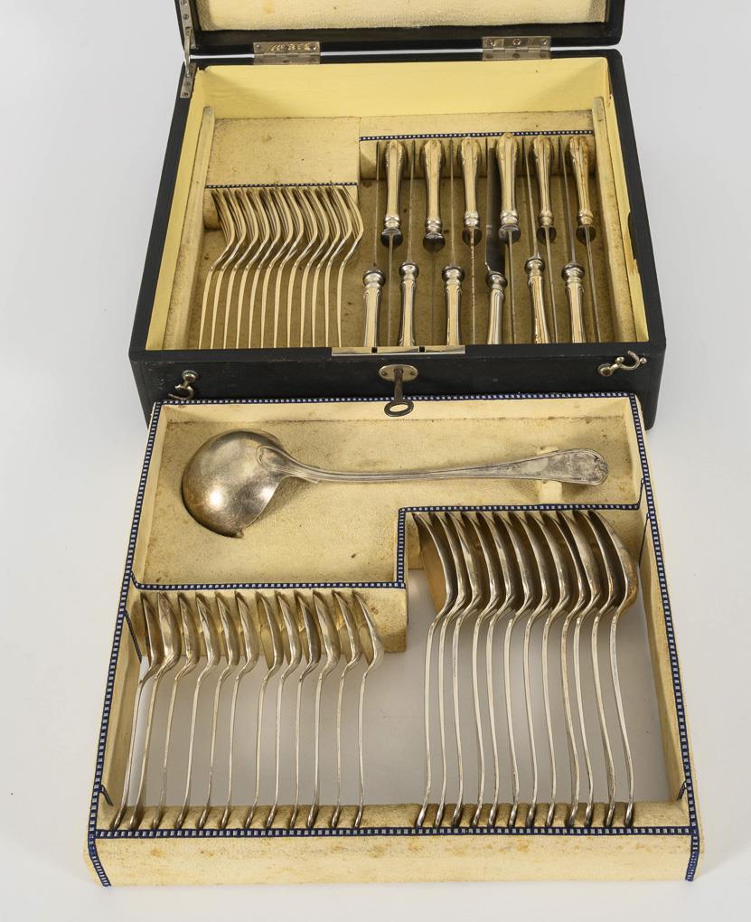 49 pieces: 12 dinner forks, dinner knives, soup spoons and coffee spoons each, plus 1 large soup ladle. In black box with removable insert. 1 key. Signs of age and wear, blades partly rusty.