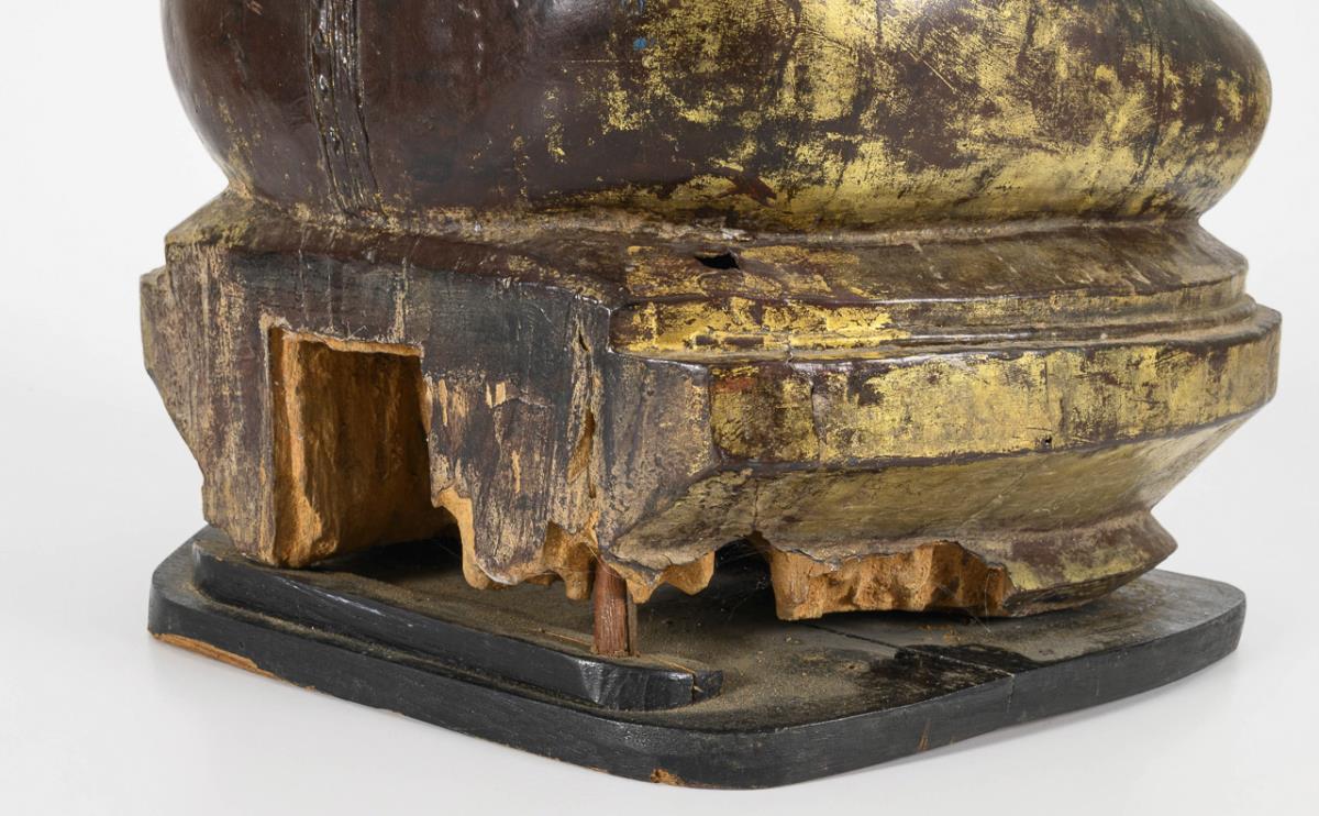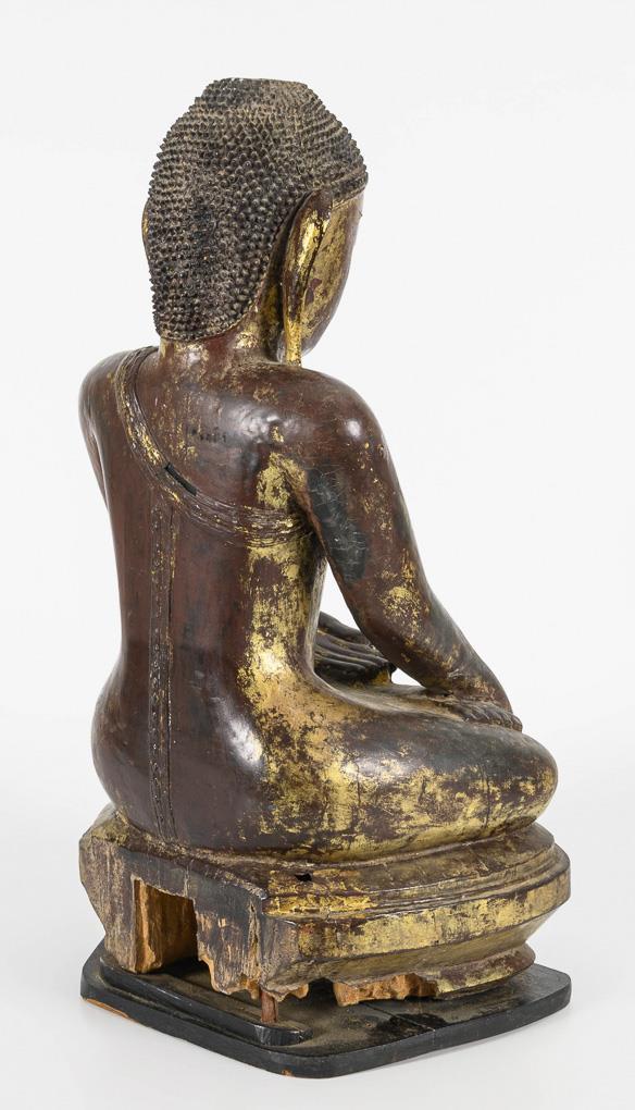 Figure seated on a flat plinth in an entangled position with the gesture of touching the ground. Remains of gilding. Large losses to the base at the back, tip of the hair missing.