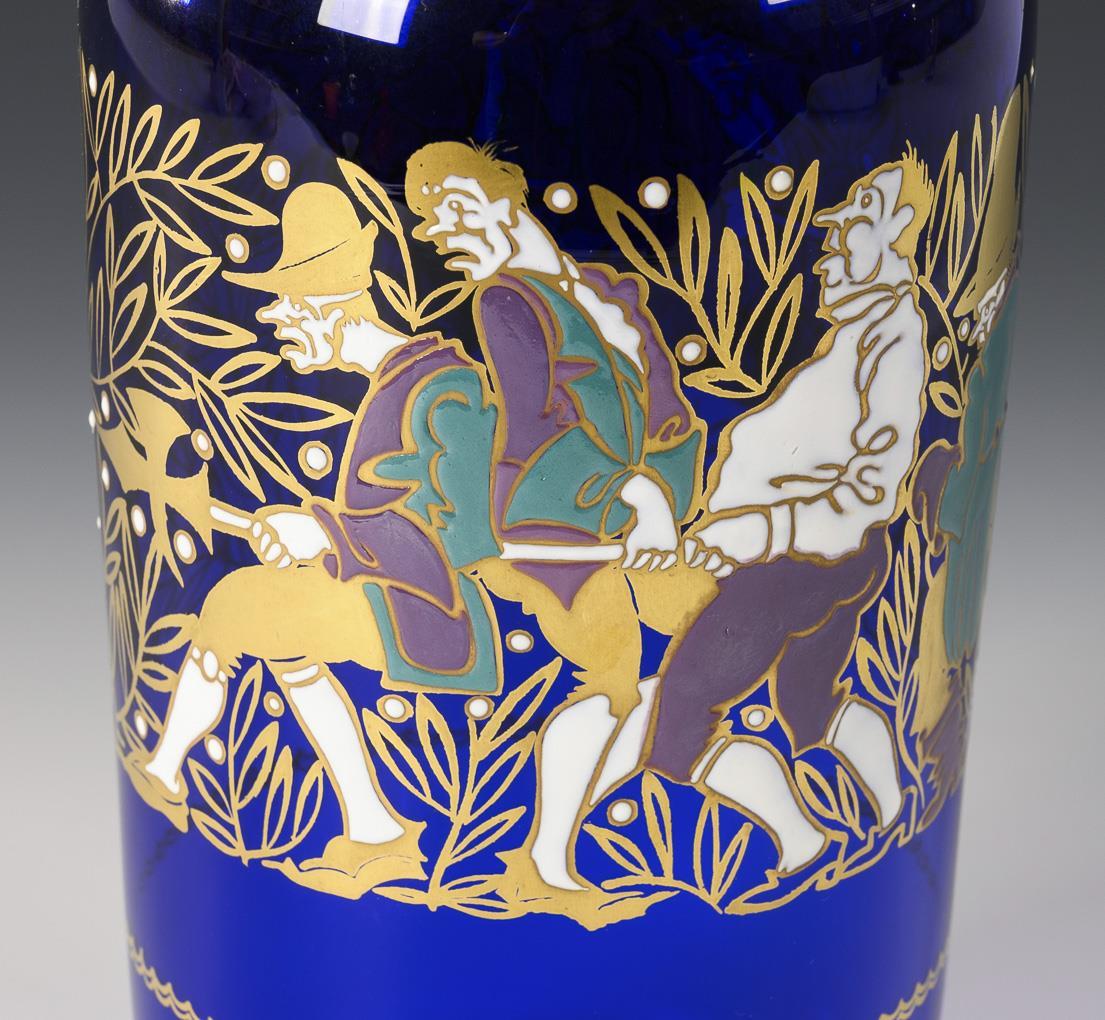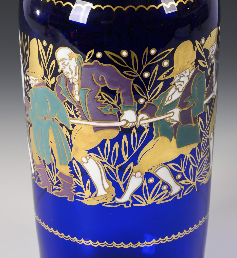 Cobalt blue glass, polychrome enamel painting, gold decoration. H 24 cm.