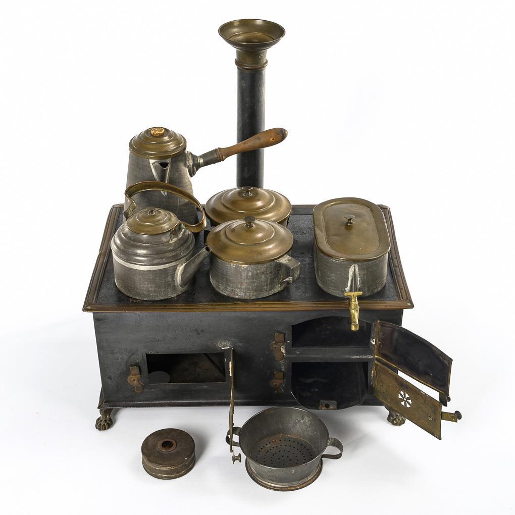 Children's stove with lion's paws, 3 oven doors, 5 hobs and chimney. Plus 3 burners, baking tray, 2 pots, 2 pots, water vessel and sieve. Signs of age and defects.
