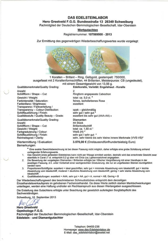 Yellow gold 750, stamped. Corals totaling ca. 5.0 ct. Diamonds totaling ca. 1.50 ct (H, VVS-VS), ring size 52. 13.56 g.
