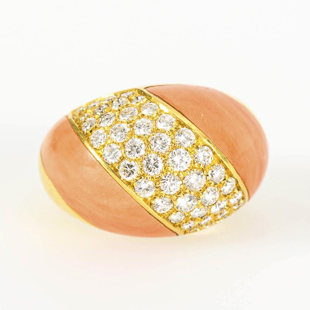 Massive ring with adjusted coral segments and 44 pavé-set brilliant-cut diamonds. Wide shank.