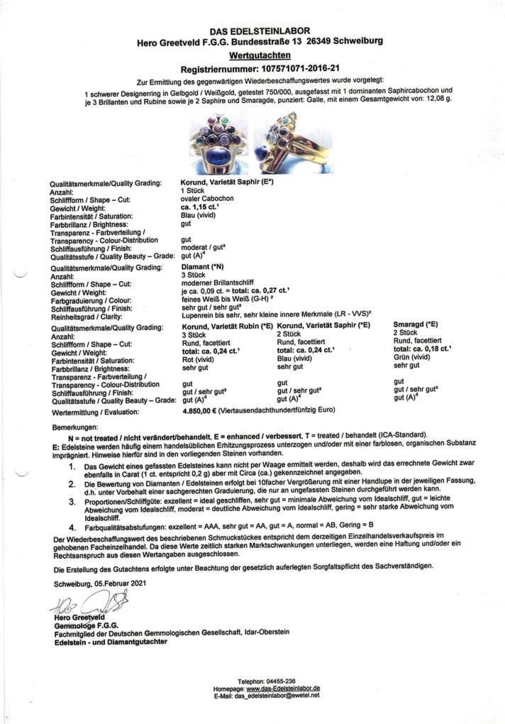 Stamped 750 yellow gold. Hallmark: Galle. Sapphire approx. 1.15 ct. 2 sapphires together approx. 0.24 ct. 2 emeralds together approx. 0.18 ct. 3 rubies together approx. 0.24 ct. 3 brilliant-cut diamonds together approx. 0.27 ct. G-H/lr-vvs. ring size 54,5. 12,8 g.