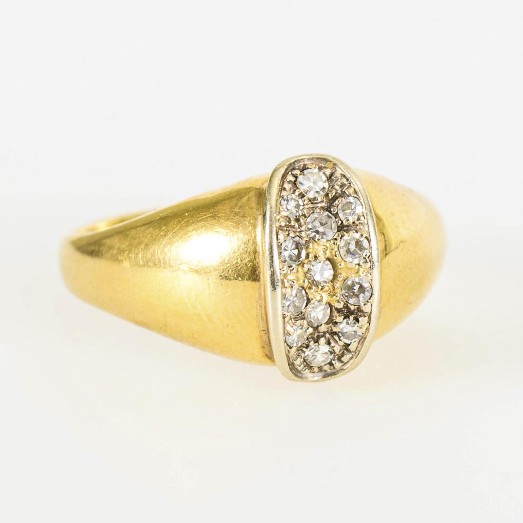 Tested yellow gold 585, indistinctly hallmarked. Diamonds in total approx. 0.20 ct. Ring size 63. 5.5 g.