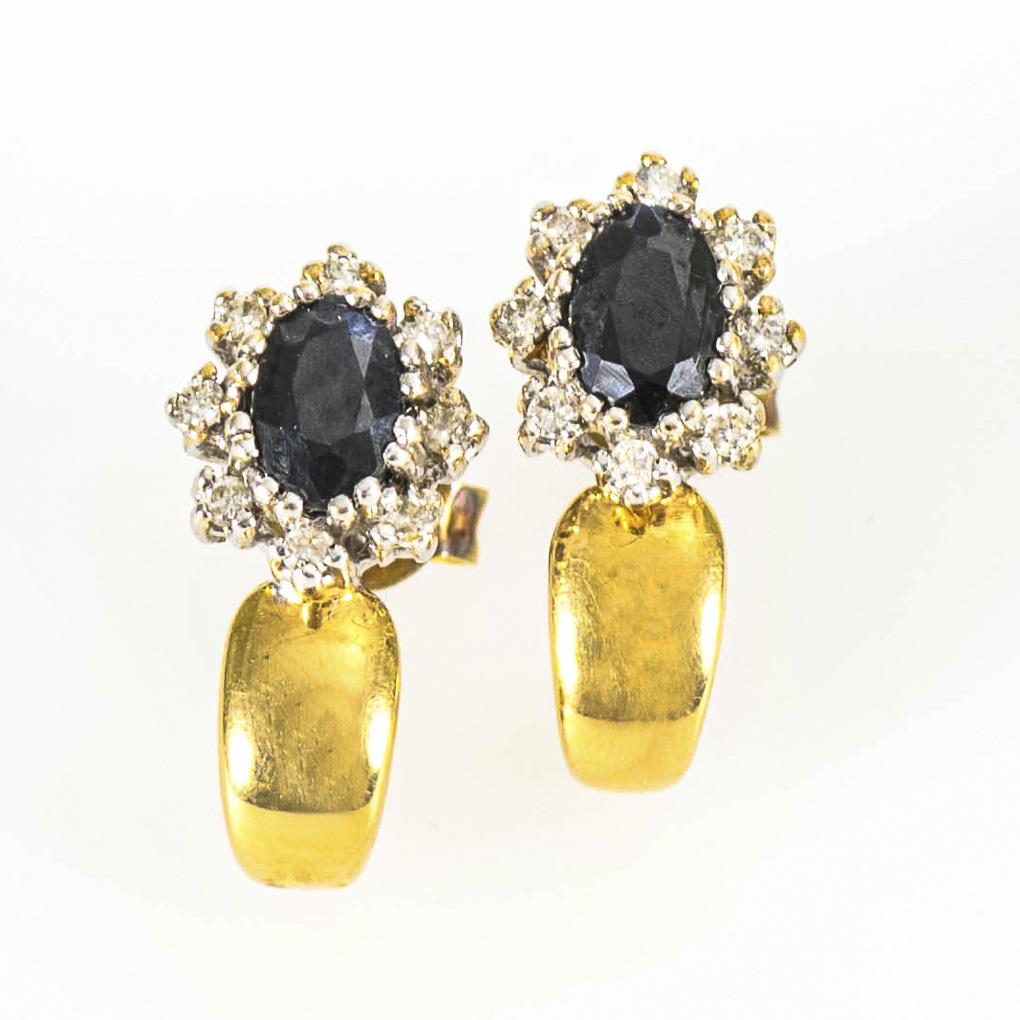 Chaton-set sapphire, each surrounded by 8 small brilliant-cut diamonds, on stud mechanism.
