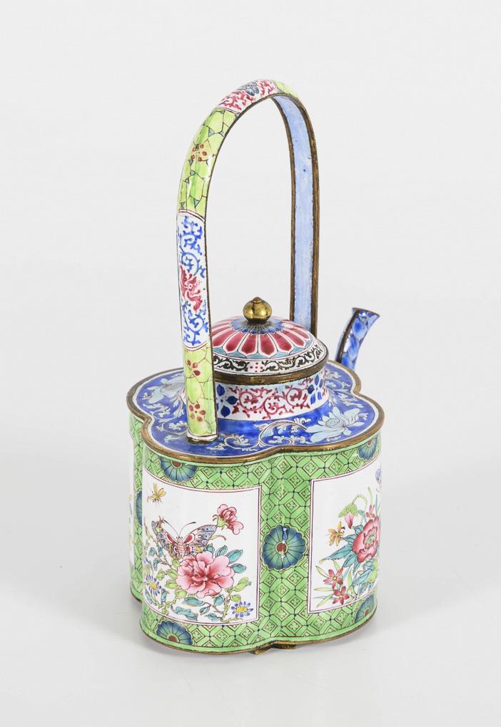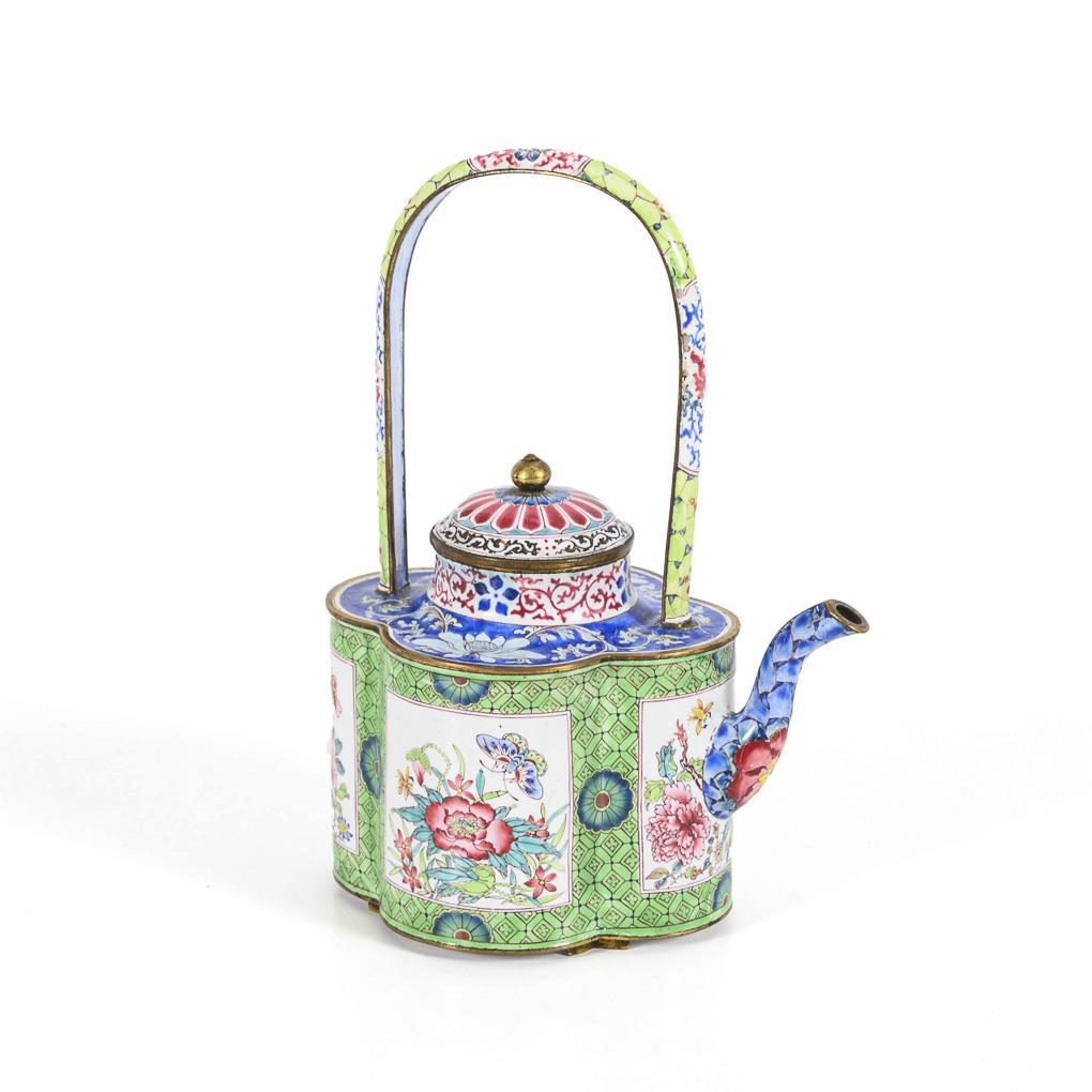 Quatrefoil body with fine painting. Päonia with insects in angular cartouches. Underside with flower mark. Probably professionally restored at the base of the handle.