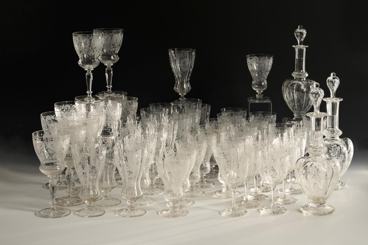 56 pieces. Partly quatrefoil shape, with quality engraved floral and rocaille decoration. 3 carafes (h 29.5, 30 and 30.5 cm). With bell-shaped bowl: 12 red wine glasses and 14 water glasses. With four-pass dome: 12 white wine glasses and 15 beer glasses.