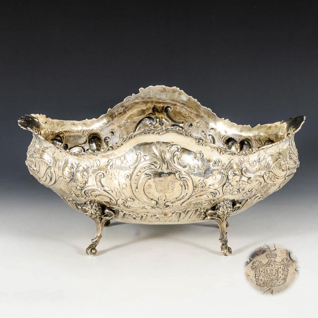 Richly reliefed, oval silver bowl with 2 small coat of arms engravings and dedication on the underside: "Staatsminister Petersen und Gemahlin zur silbernen Hochzeit, 24. April 1898 von Fürst und Fürstin von Schwarzburg-Sondershausen". Rim with small cracks.