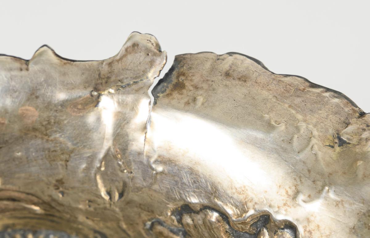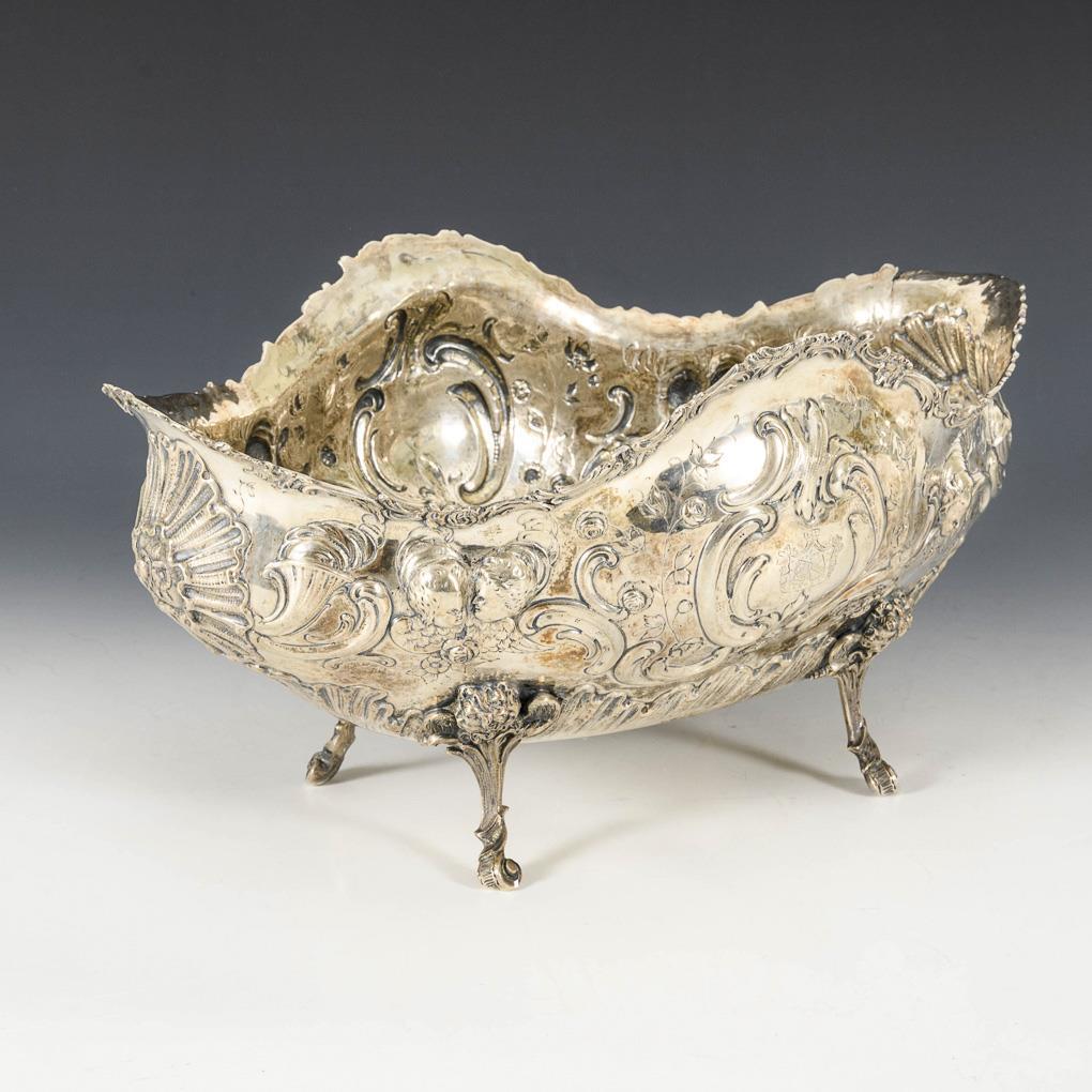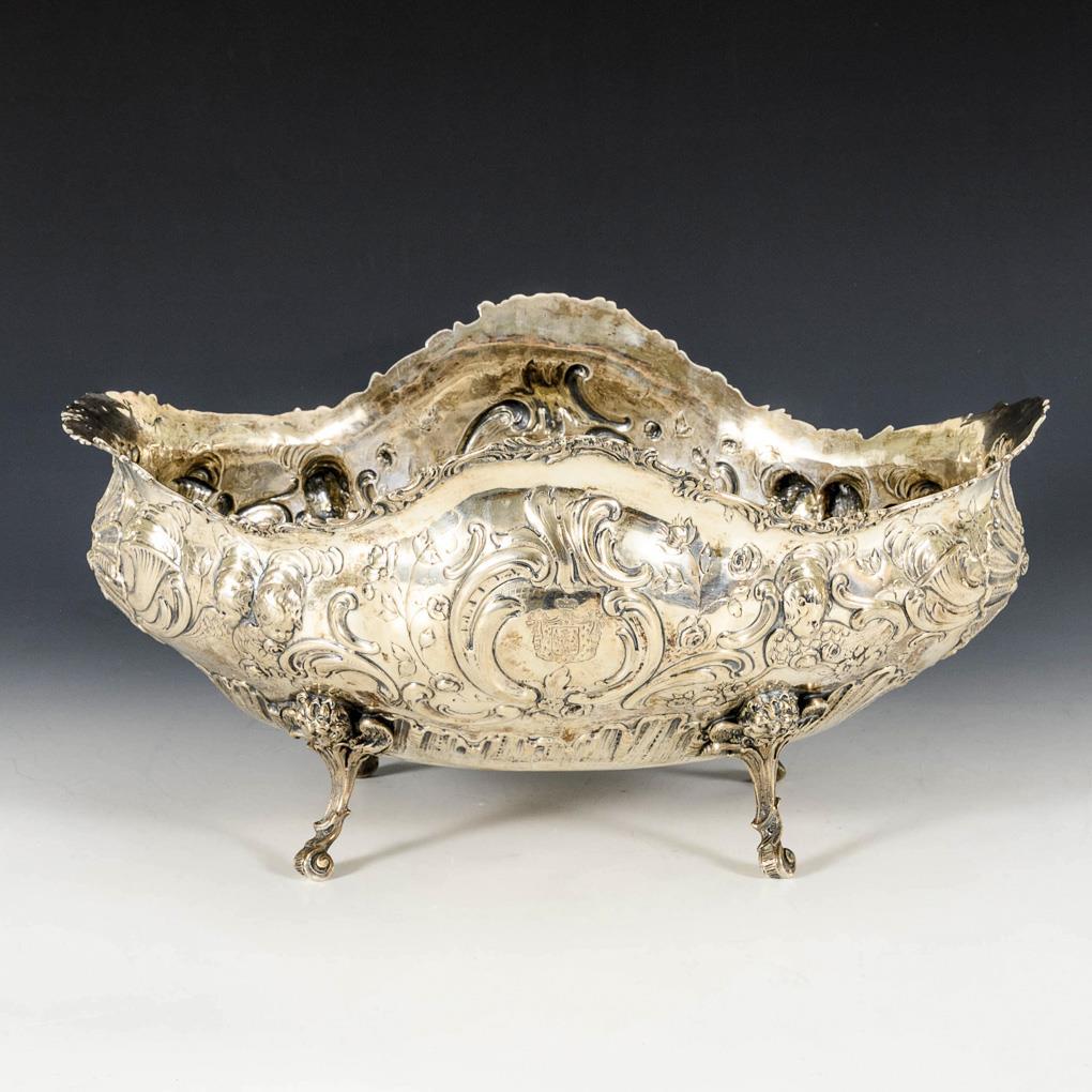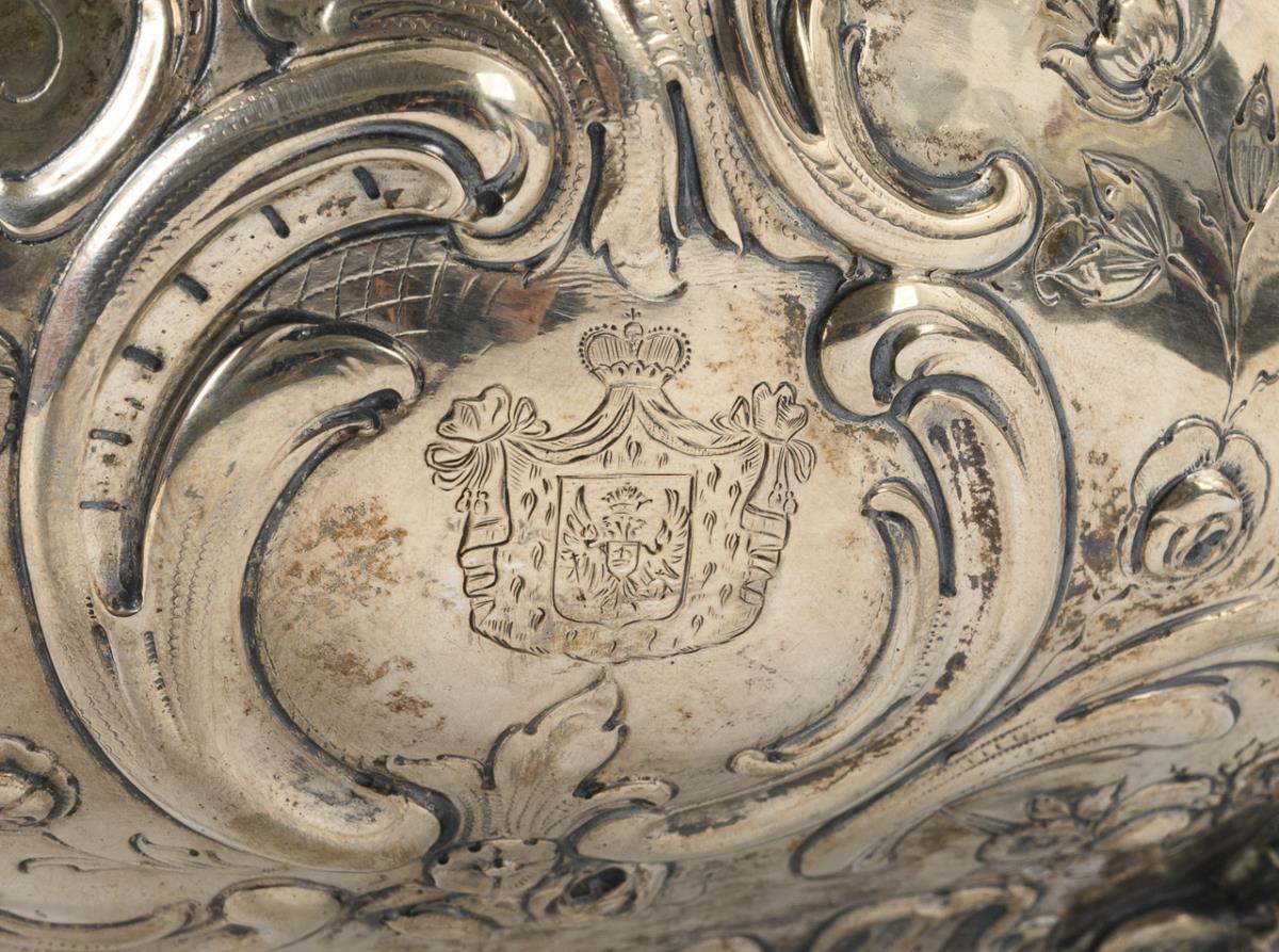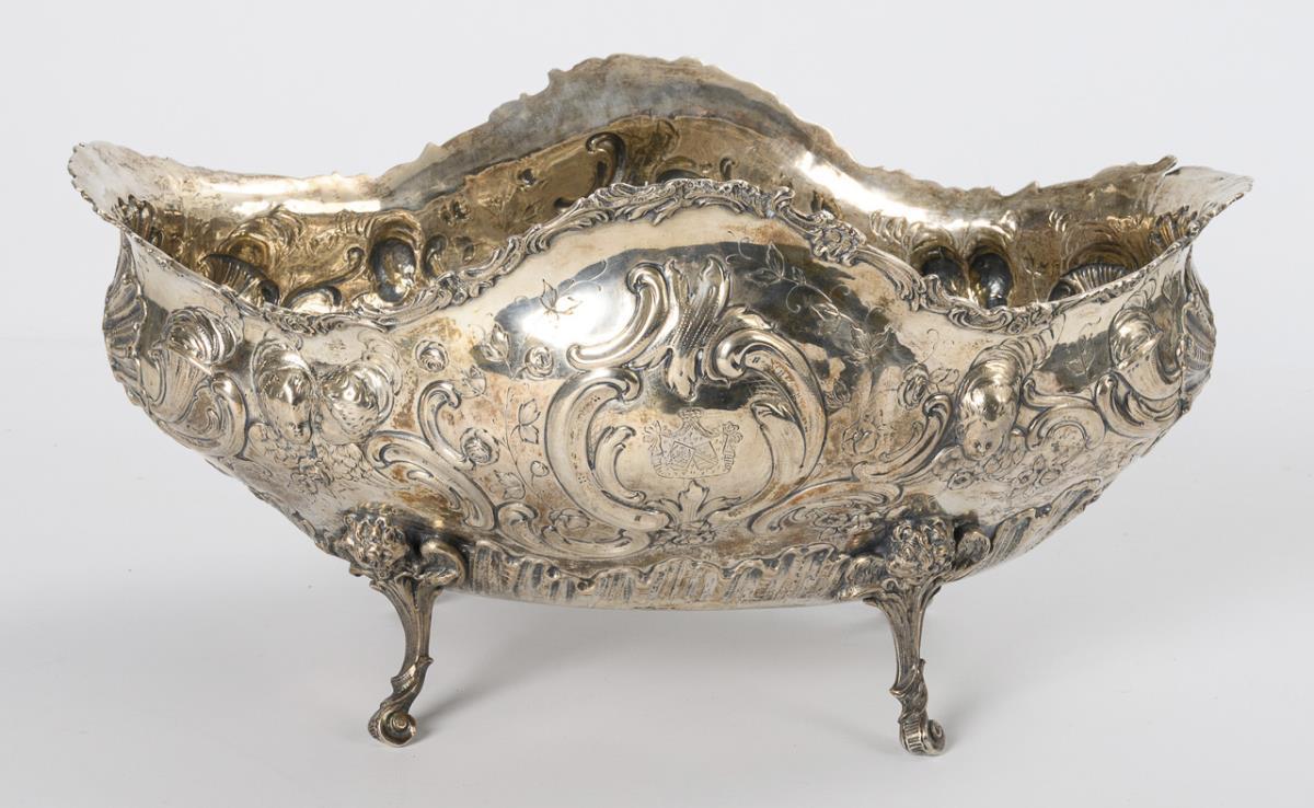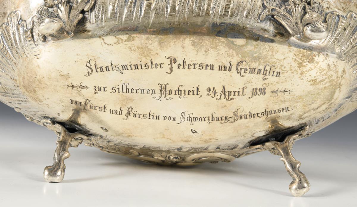 Richly reliefed, oval silver bowl with 2 small coat of arms engravings and dedication on the underside: "Staatsminister Petersen und Gemahlin zur silbernen Hochzeit, 24. April 1898 von Fürst und Fürstin von Schwarzburg-Sondershausen". Rim with small cracks.