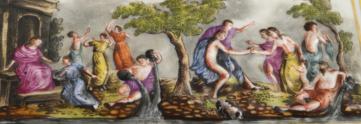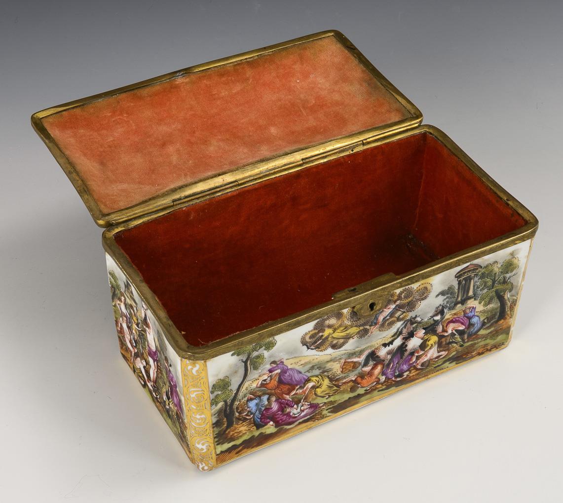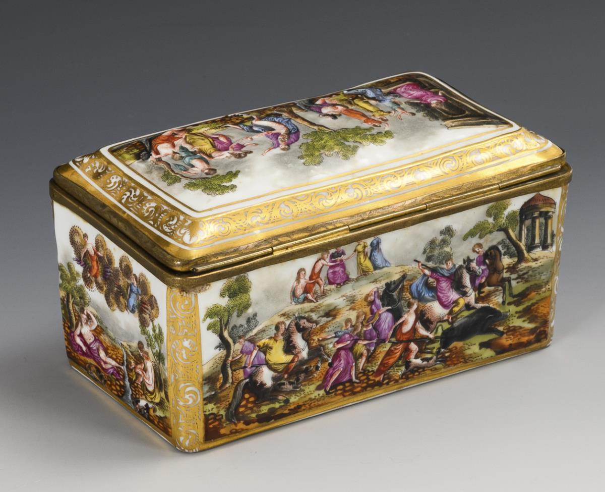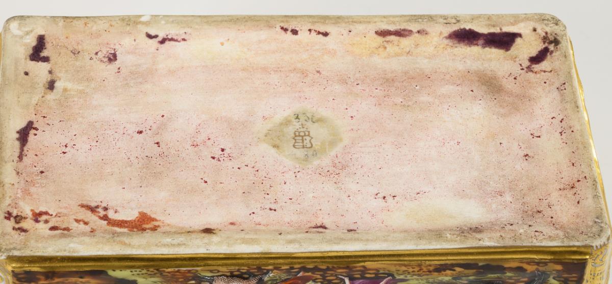 Rectangular box with metal-mounted hinged lid with lock and colorfully painted figure reliefs on all sides, lined inside with red velvet. Without key.
