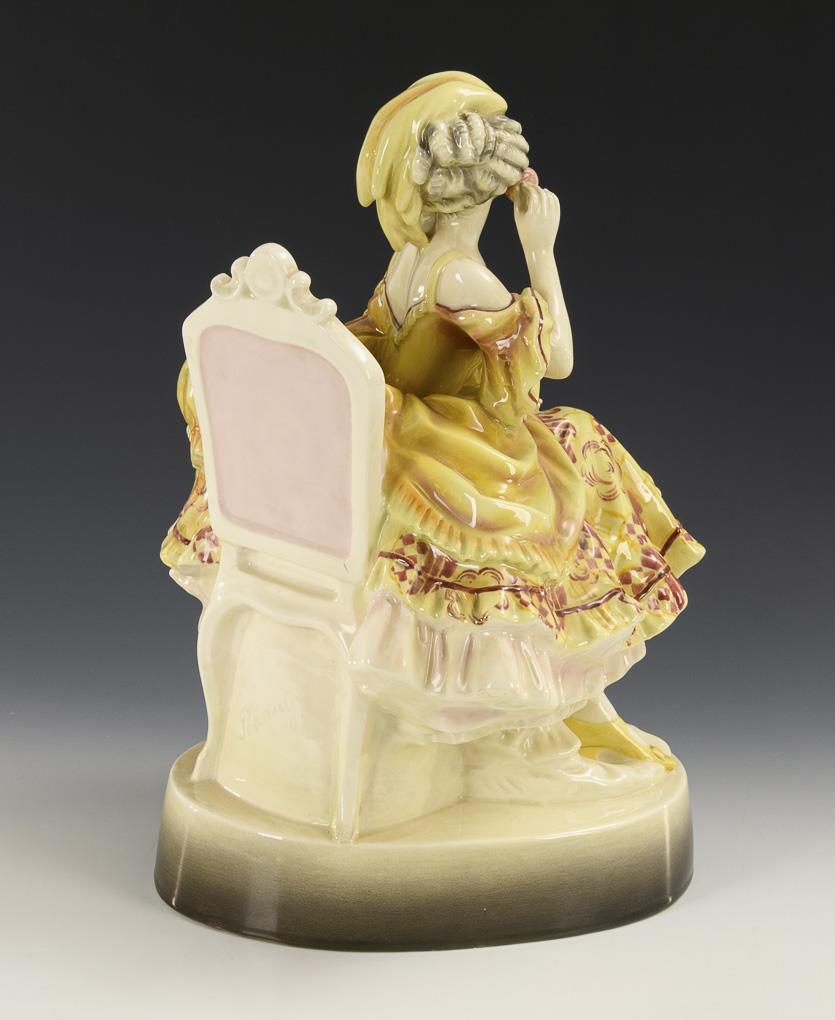 Seated, powdered ball lady in a yellow rococo dress, on an oval plinth.