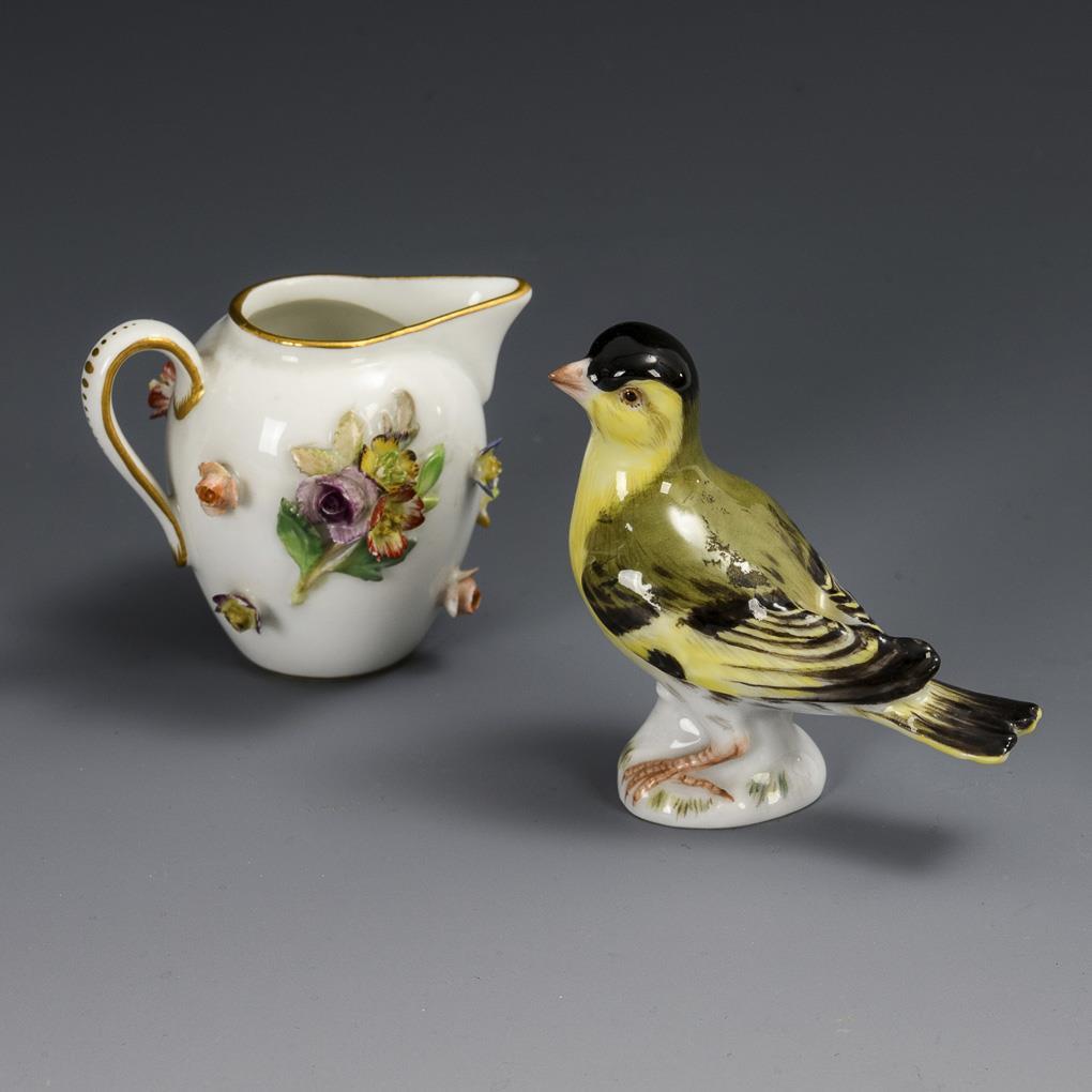 1x 2nd half 20th century, model no. 77208, design 1763 by Johann Joachim Kaendler (1706-1775) and collaborator: Zeisig (H 5.5 cm). / 1x 1850-1924, jug with blossom overlay (h 4.5 cm). Both 1st choice. Flower cover minimally bumped.