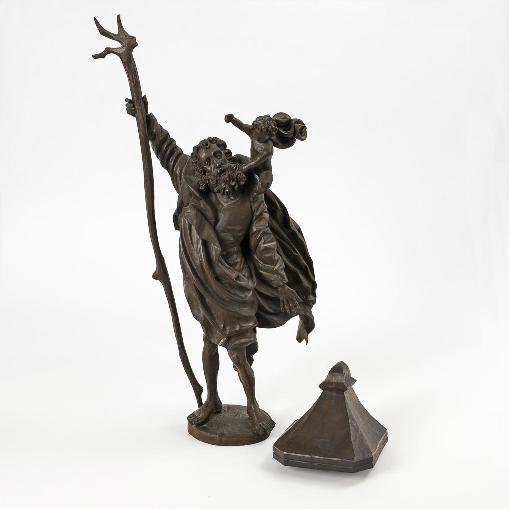 Saint standing on the original wall console with baroque robe, the infant Jesus reaching into his beard. The right hand of Christophorus replaced, 1 finger glued to the left. Dry crack on the plinth.