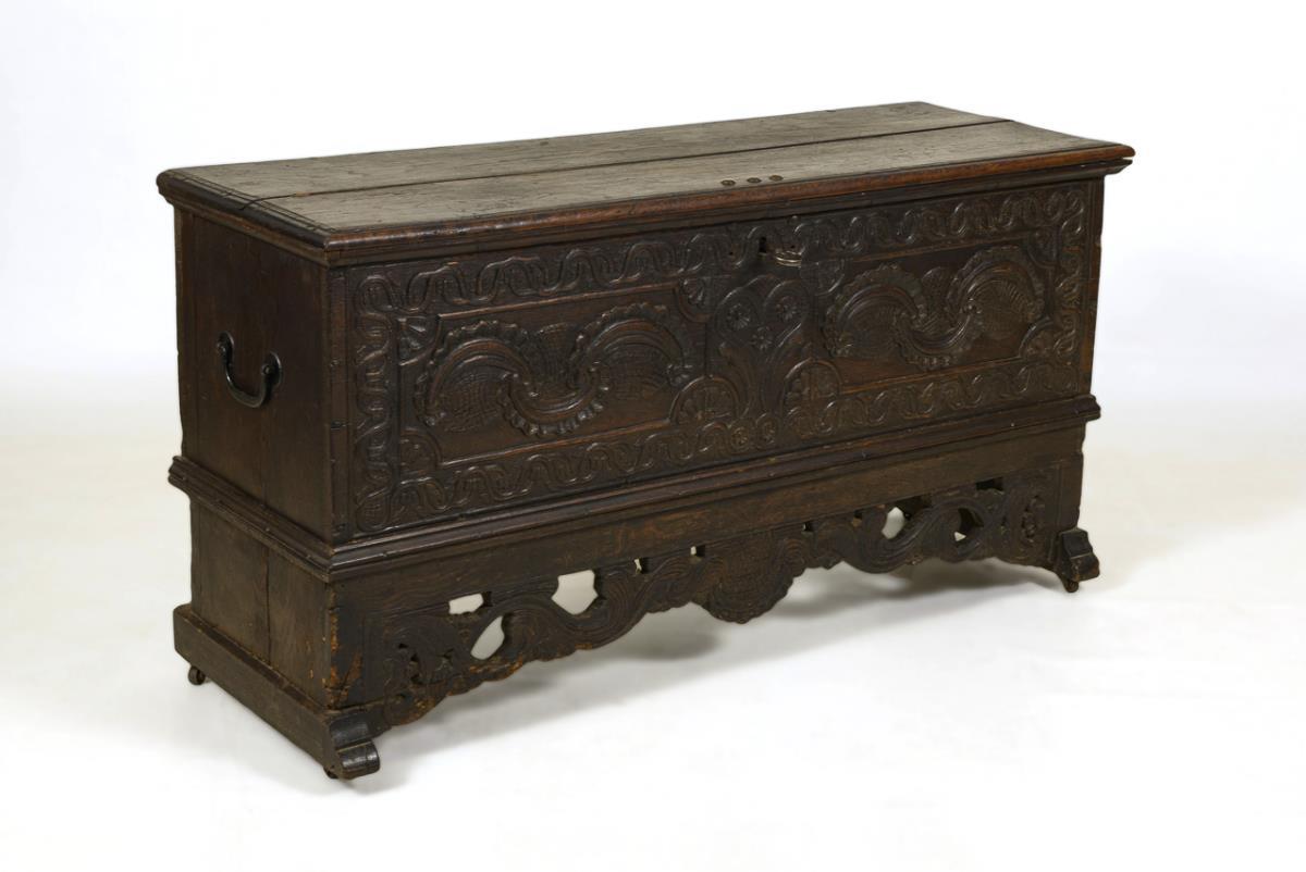 Wide chest with side carrying handles, mock coffering on the front with wavy bands and floral flat carved ornamentation, à-jour carved decorative panel on the high frame, on sled feet. Inside a sideboard. Dry cracks, signs of wear, lid of the sideboard missing, strong signs of age and use, some additions.