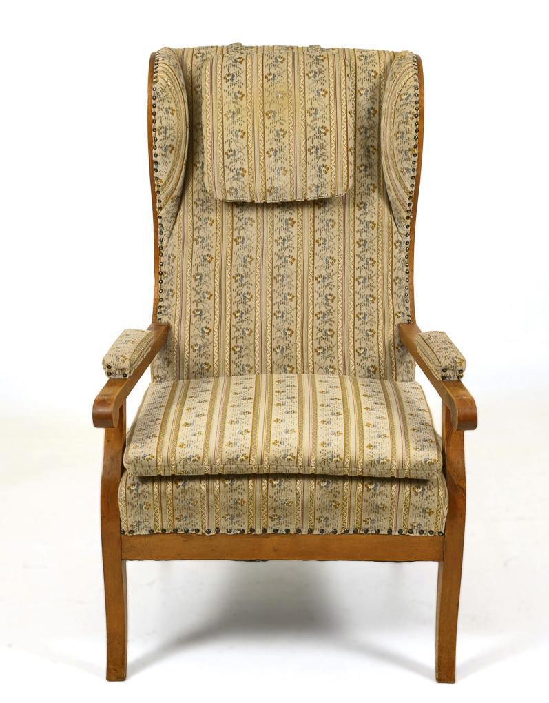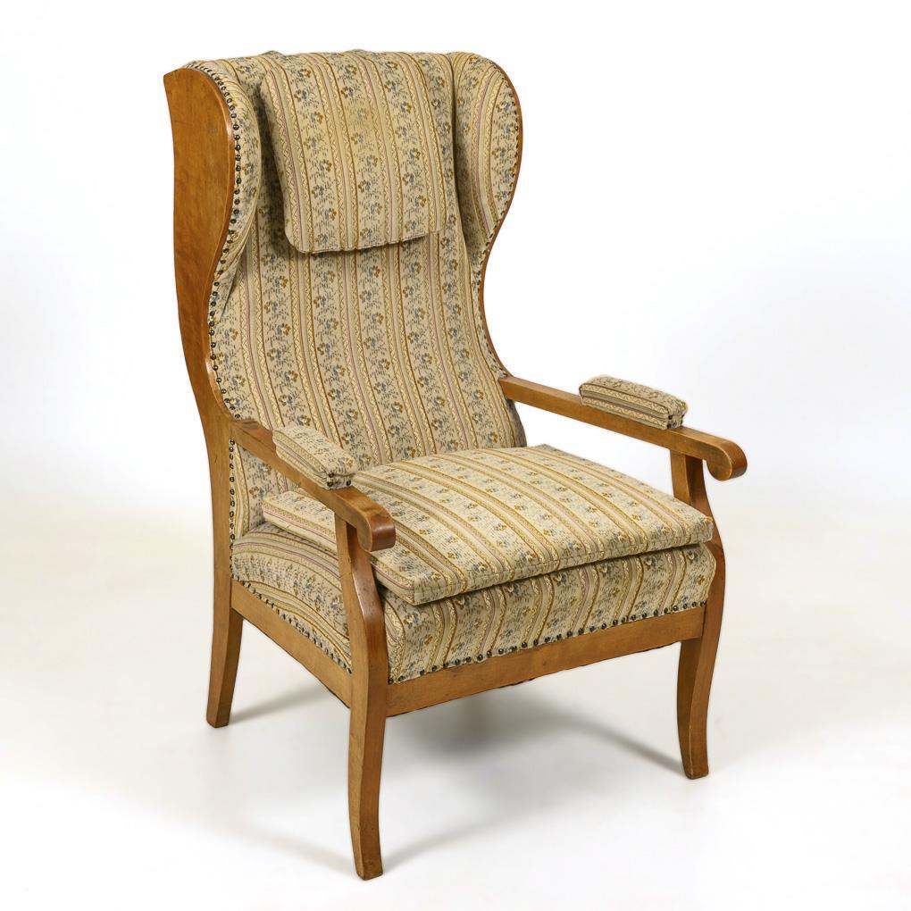 Upholstered armchair with 2 eared backrests, straight armrests with partial upholstery and end volutes, on 4 slightly curved legs. Younger upholstery with floral-striped fabric cover, separate seat cushion pad and hanging head cushion, upholstery nail-edged. Slight signs of age and use, minor defects in places.