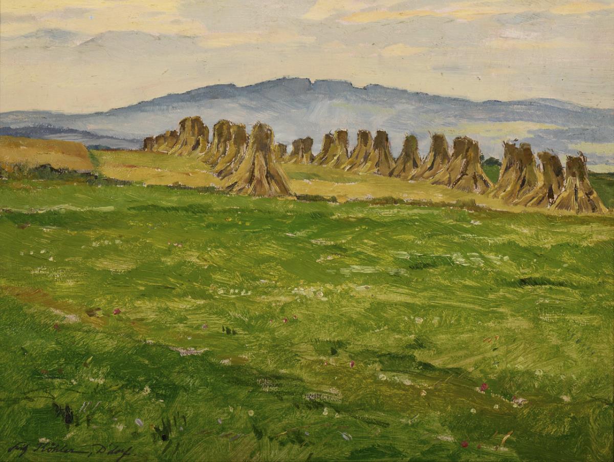 The hay swards in the field next to the meadow under a cloudy sky. Slight traces of age.