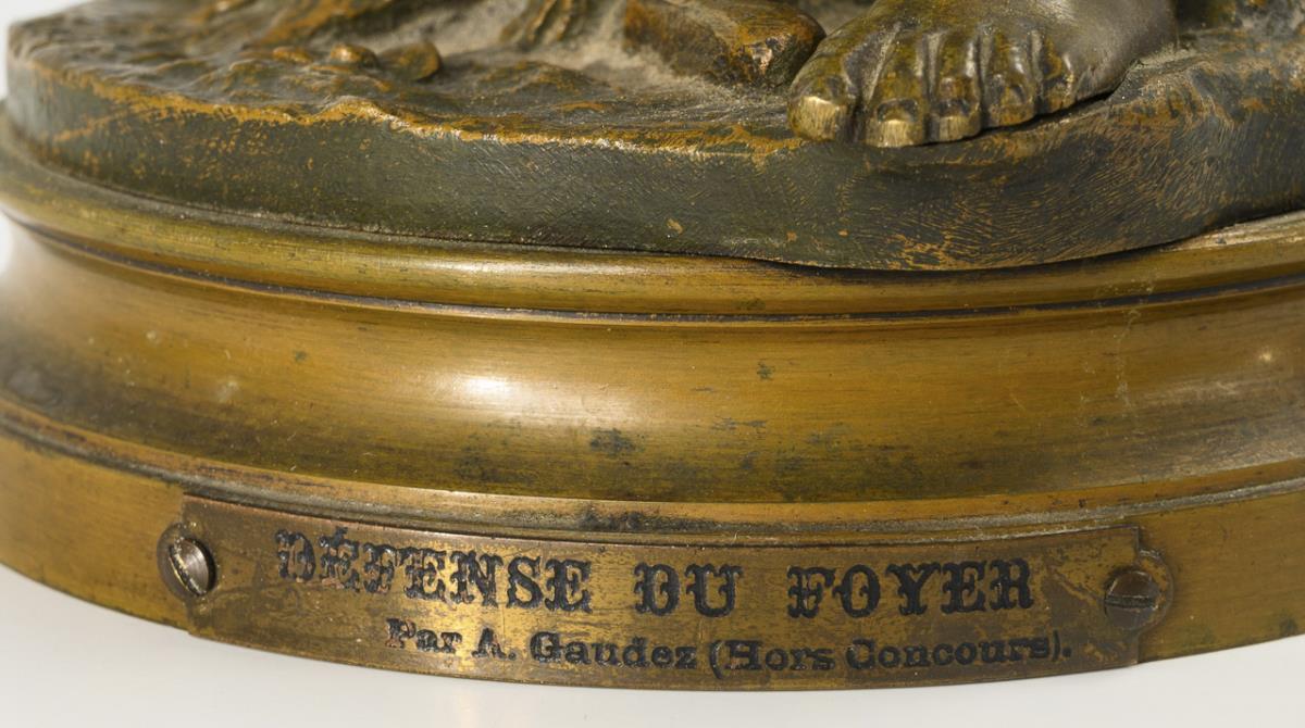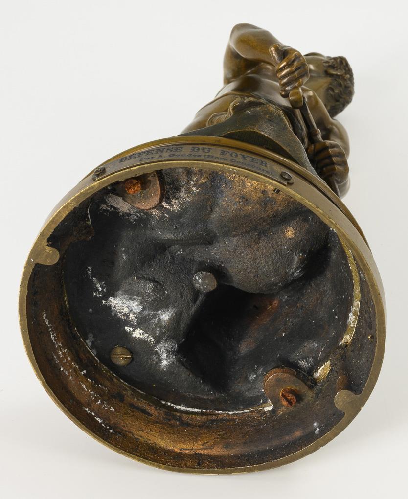Bronze patinated, bronze plinth. Marked, inscribed "par" on the plaque and titled "Hors Concours", "Défense du Foyer". H 25 / 29 cm.