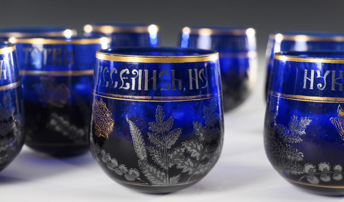 Small, bulbous goblets with etched fern leaves and butterfly in gold and silver, each with a Russian toast in Cyrillic letters below the rim. Silver and gold partly rubbed.