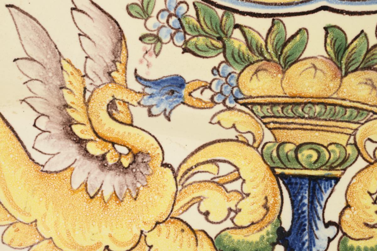 Large faience plate with coat of arms and cornucopias. St. Clément.
