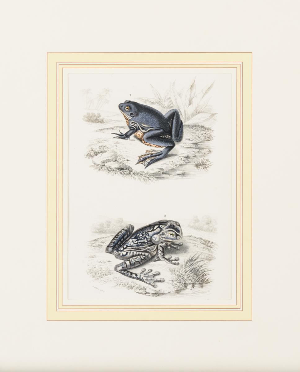 10 Tierdarstellungen in ihrer natürlichen Umgebung: Robbe, Nashorn, Schnabeltier, Delphin sowie je 2 verschiedene Frösche, Wale und Kängurus, bezeichnet in französischer und lateinischer Sprache
