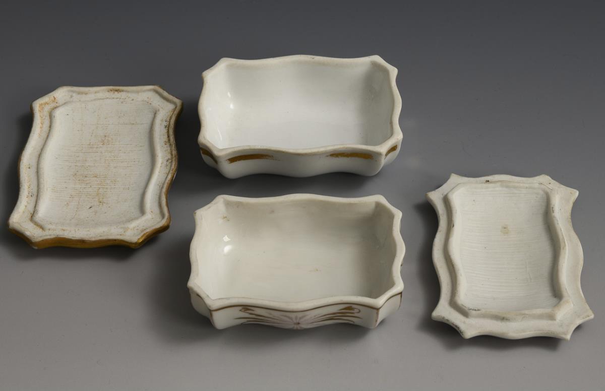 Rectangular boxes with multi-pass walls, each with a rubbing surface for matches on the underside of the lid. 1x indistinct blue mark: on the lid the sepia-painted, inscribed view of the town of Wyk on the North Sea island of Föhr (3.5 x 9.3 x 6.5 cm). / 1x unmarked: on the lid the inscribed view of the town "Reichenbach in Schlesien" (3 x 8.5 x 6 cm). Partial gold abrasion.