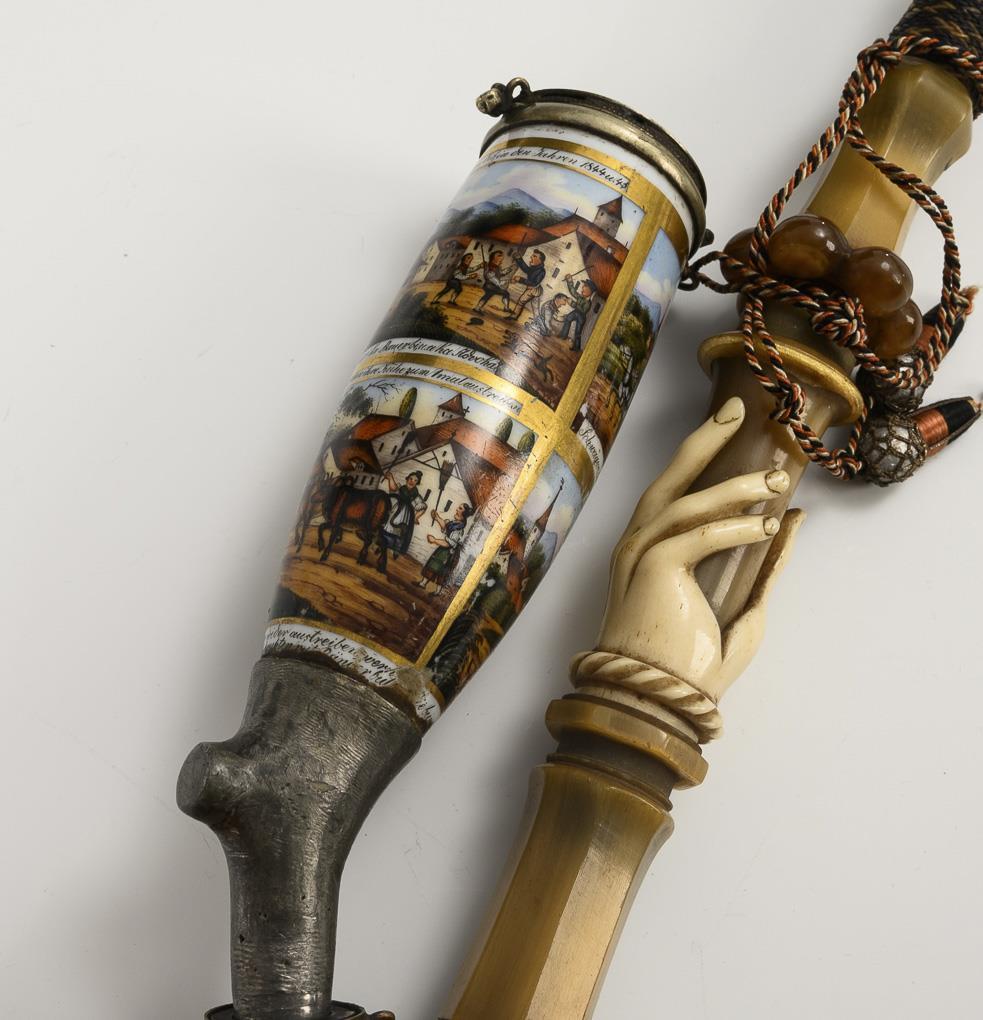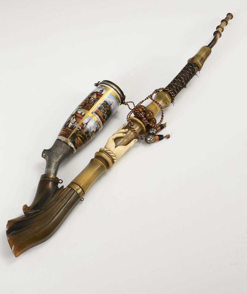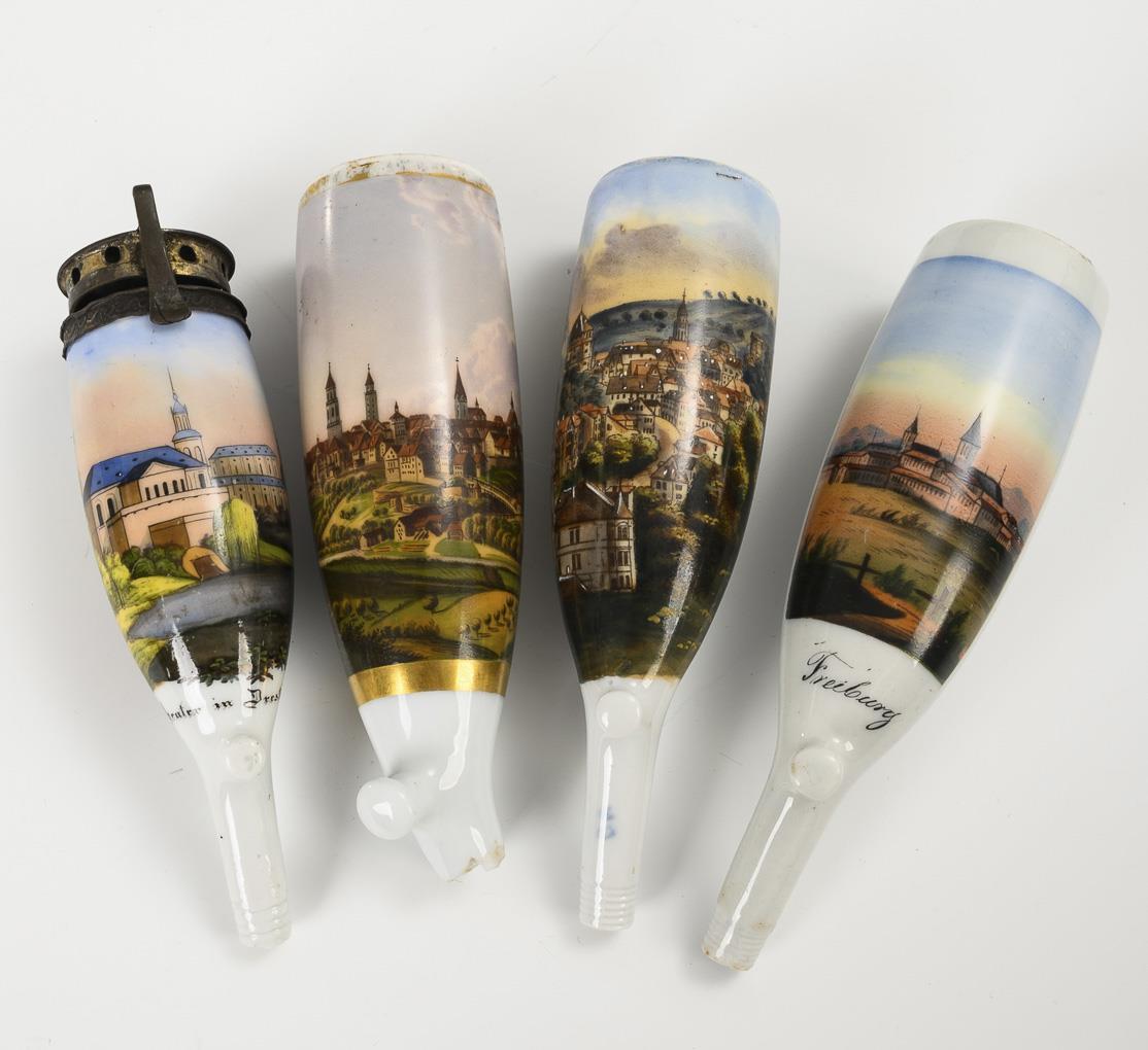 8 pipe bowls and 1 pipe with various views (including: Tübingen, Freiburg, Bonn), pipe stem made of cow horn and bone, 3 pipes with metal-mounted hinged lid / 1 pipe bowl with the depiction of a soldier with horse. 1x base defective, 1x cracked wall hairline, 1x replaced base, signs of wear.