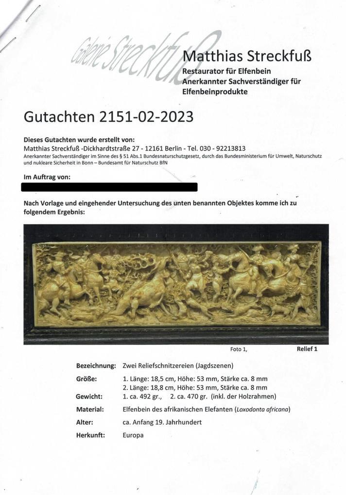 African ivory, ebonized wood. 5 x 18.5 and 5 x 18 cm respectively, frame 13.5 x 27 cm each. 492 and 270 g (with frame).