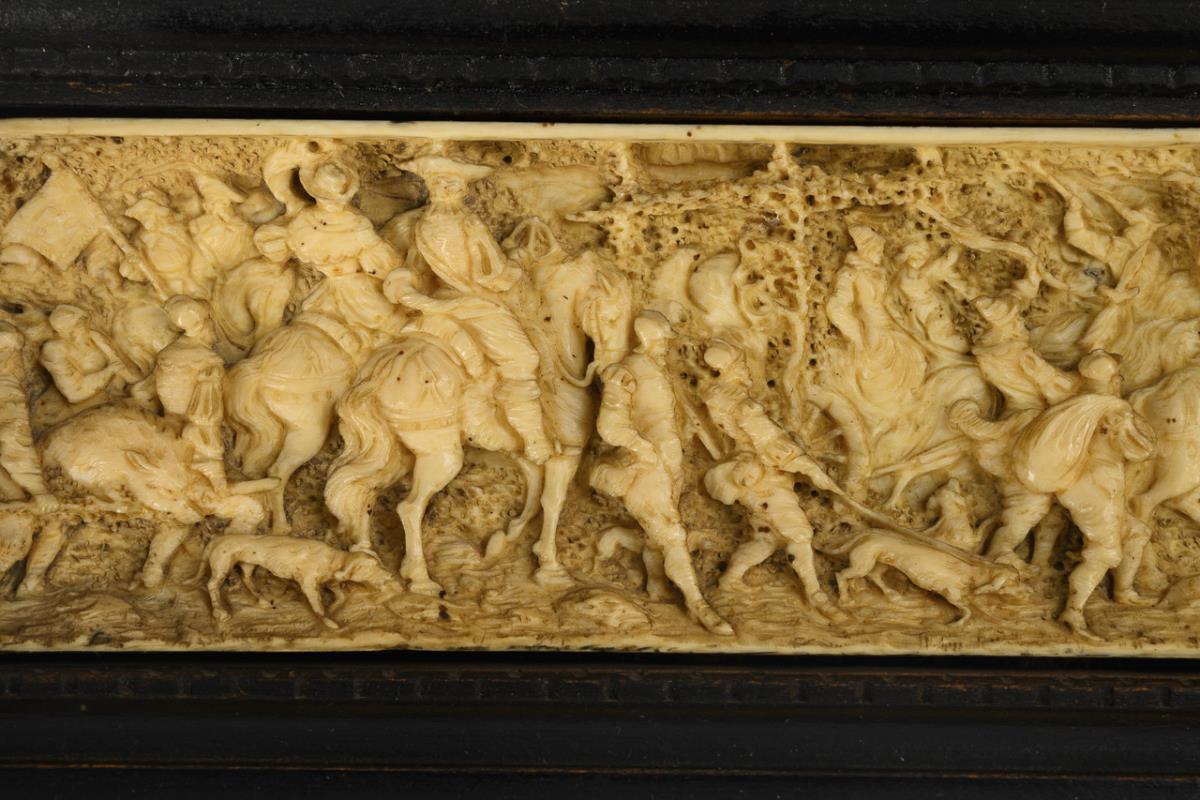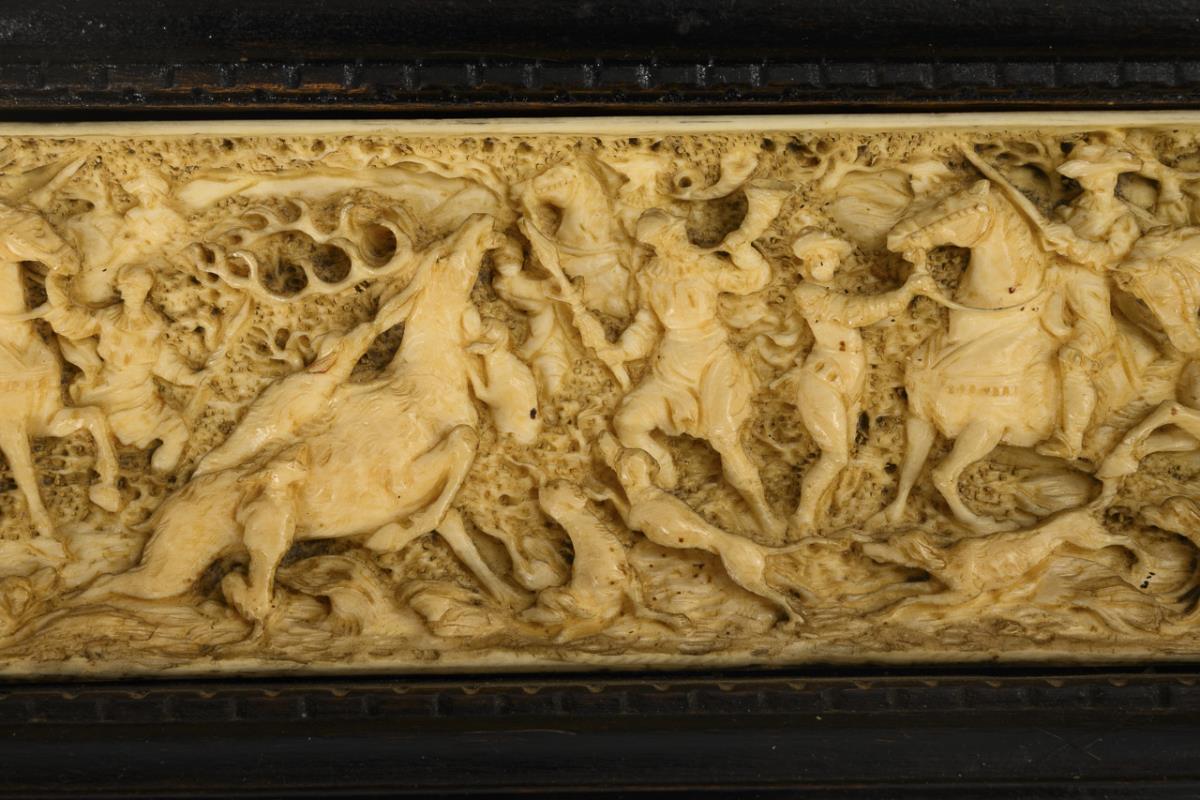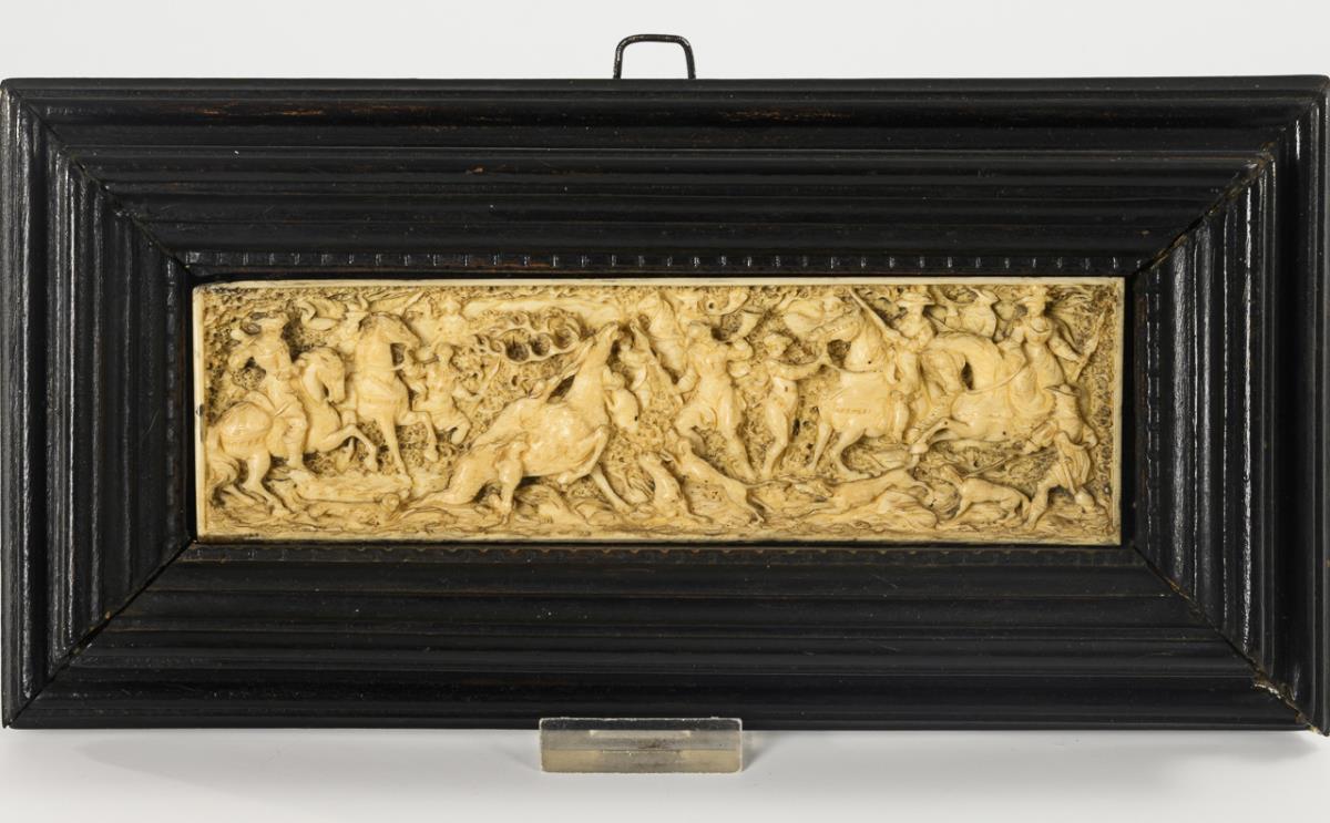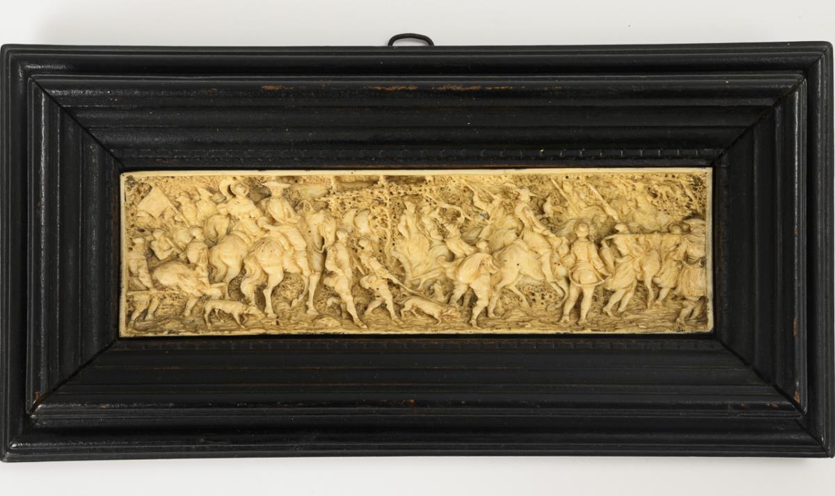 Finely carved Renaissance-style scenes of a stag hunt and the return home from the hunt with wild boar and feathered game. The courtly hunting parties consist of ladies and gentlemen on horseback as well as numerous foot soldiers with dogs. Each in a profiled wooden frame. Each somewhat soiled, frame partly open glue joints with traces of glue.