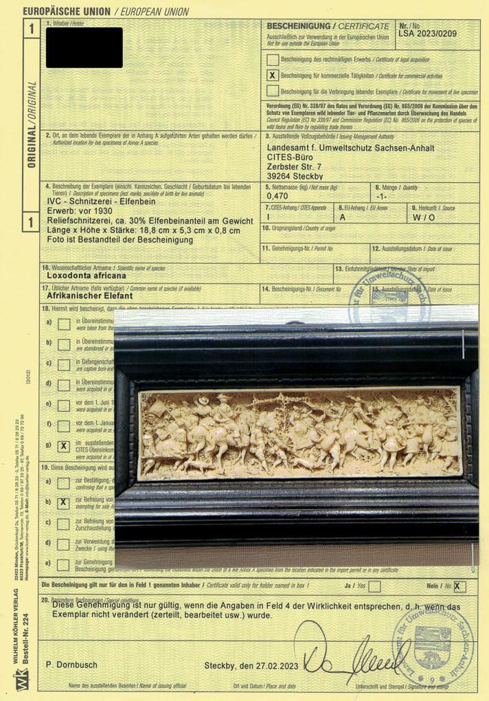 Each panel has a Cites-EU trade license and a certificate from the expert Matthias Streckfuß. No export outside the EU.