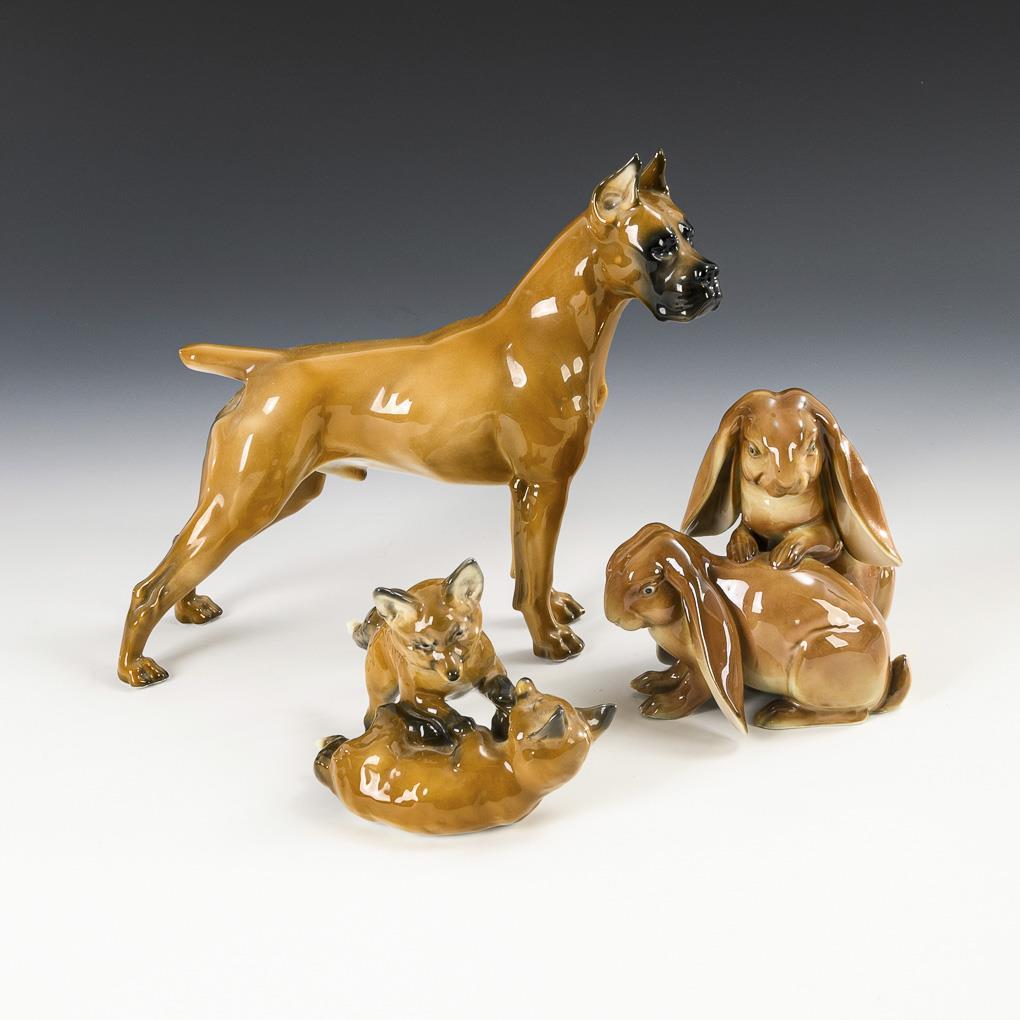 2x ROSENTHAL: Boxer, model no. 1134, design 1930 by Theodor Kärner (1884-1966) and two playing fox cubs, design by Fritz Heidenreich (1895-1966). / 1x probably GALLUBA & HOFMANN, model no. 5987: pair of hares (H 12.5 cm). 1 hare's paw bumped.