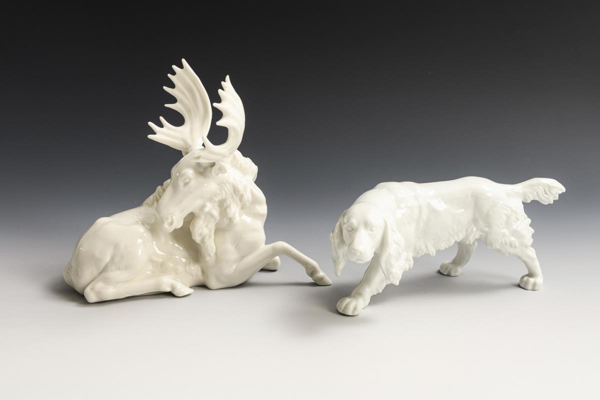 1x HUTSCHENREUTHER, from 1955, design by Karl Tutter (1883-1969): lying elk (H 19 cm). / 1x ROSENTHAL, 1956, model no. 586: cocker spaniel (H 9.5 cm).
